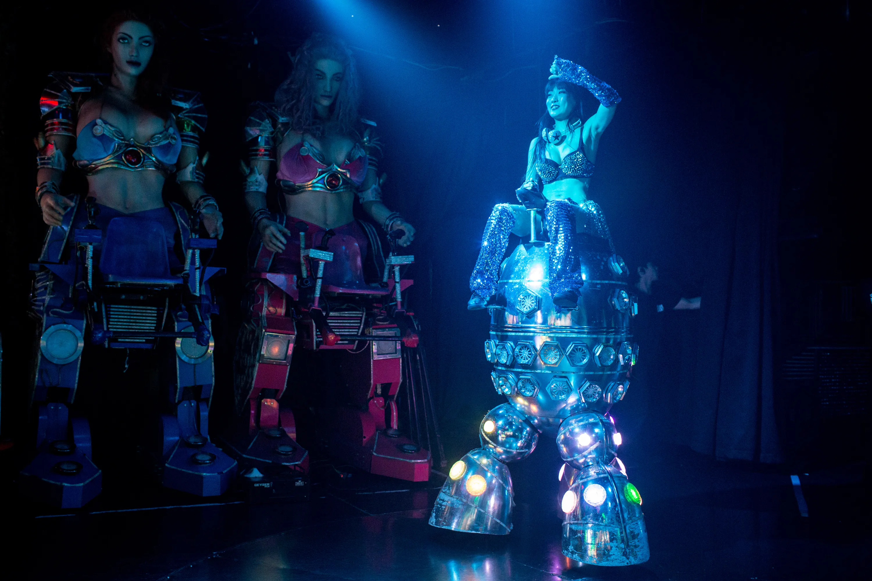 A dancer rides a robotic vehicle during a show at The Robot Restaurant on June 29, 2014 in Tokyo, Japan. The now famous Robot Restaurant opened two years ago in Kabukicho area of Shinjuku at an estimated cost of 10 million U.S. dollars. Performances are held three times a day and cater mostly to foreign tourists. The cabaret style shows include bikini clad futuristic dancers, performers dressed as robots and a host of large scale robots and vehicles controlled with remotes by stage hands dressed as Ninjas. (Photo by Chris McGrath/Getty Images)