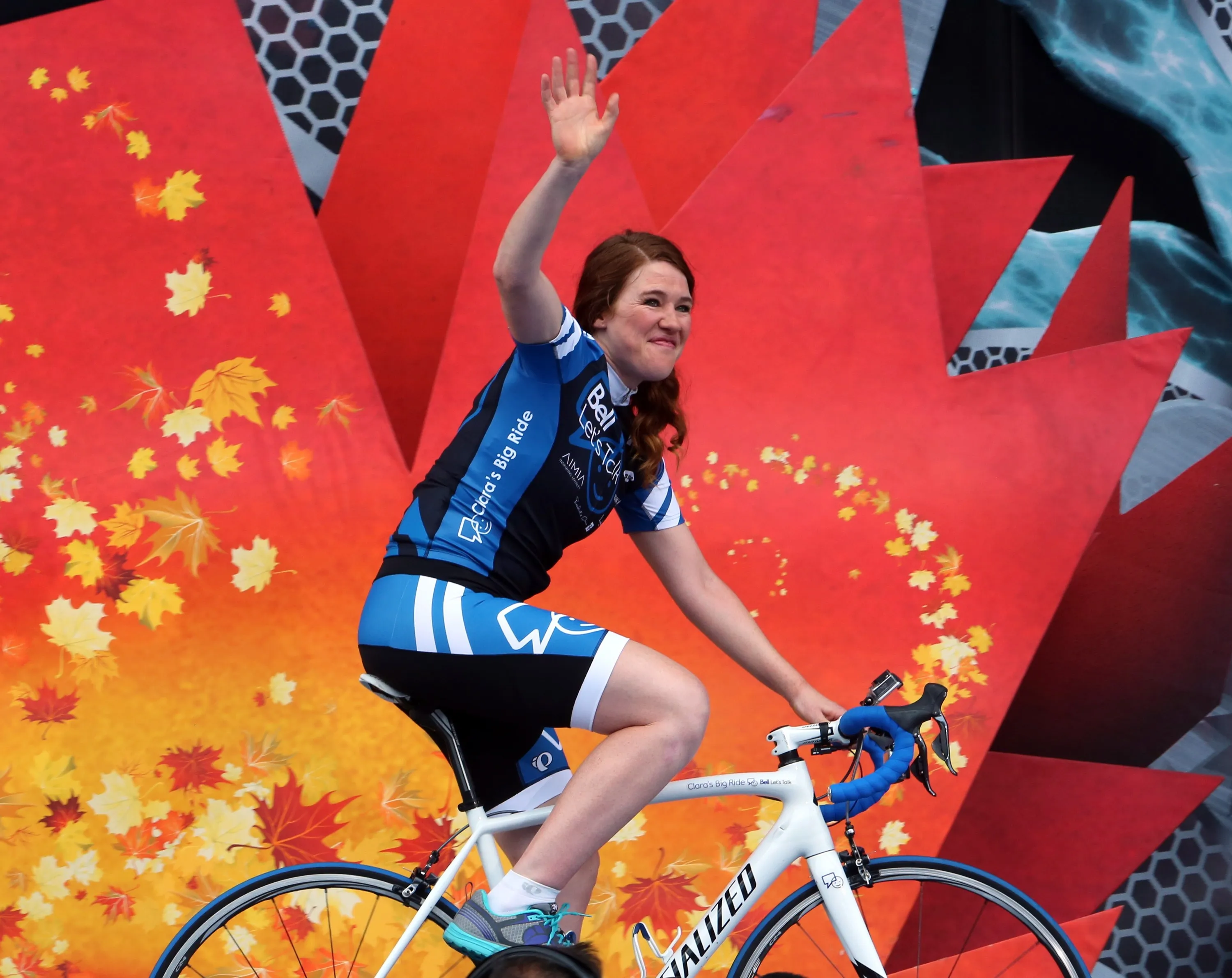 Olympic athlete Clara Huges waves on stage as she completes her cross Canada tour during Canada Day celebrations on Parliament Hill in Ottawa, Tuesday July 1, 2014. (Photo by Fred Chartrand/The Canadian Press)