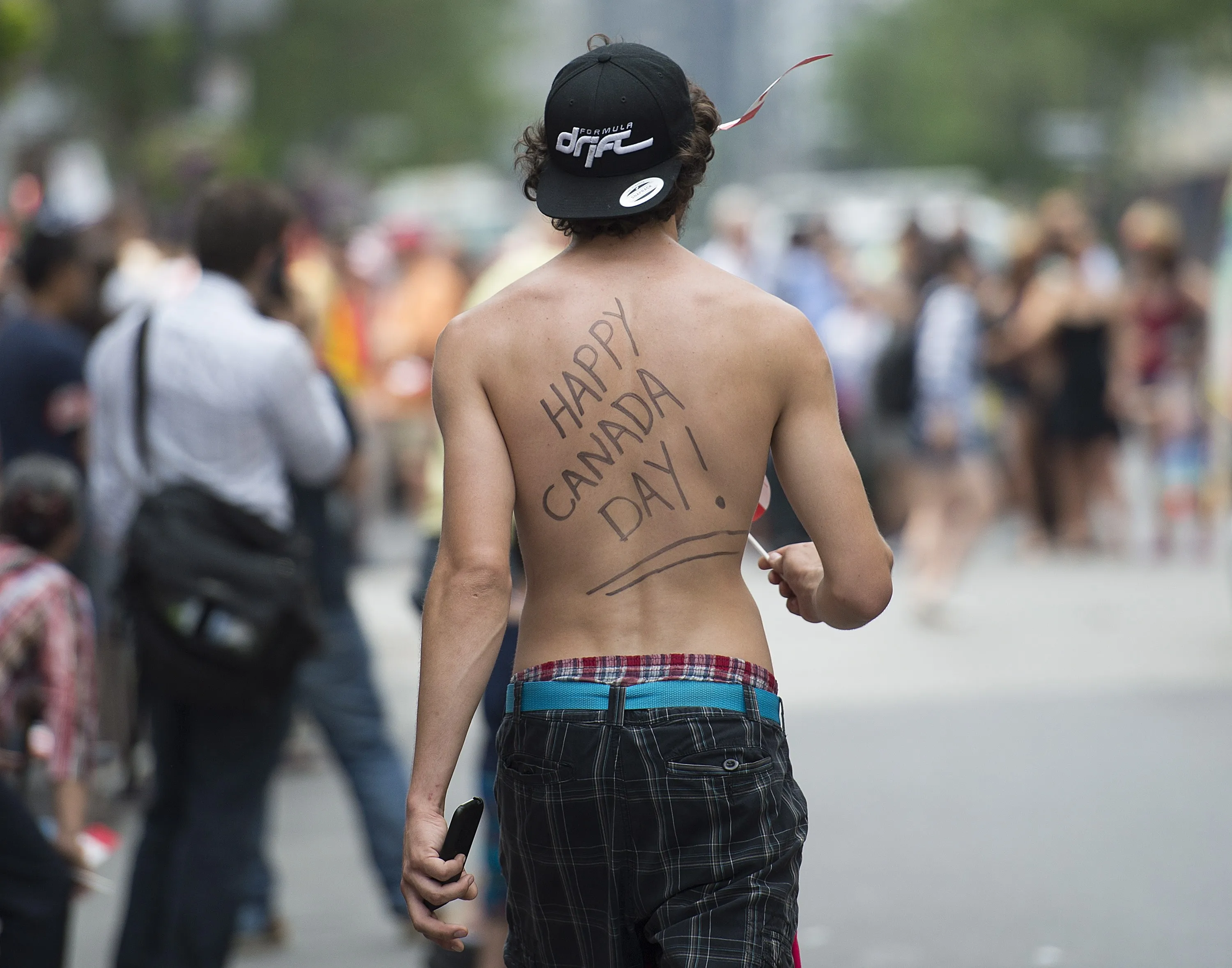 A man with a Canada Day message on his back looks on during the annual Canada Day parade in Montreal, Tuesday, July 1, 2014. (Photo by Graham Hughes/The Canadian Press)
