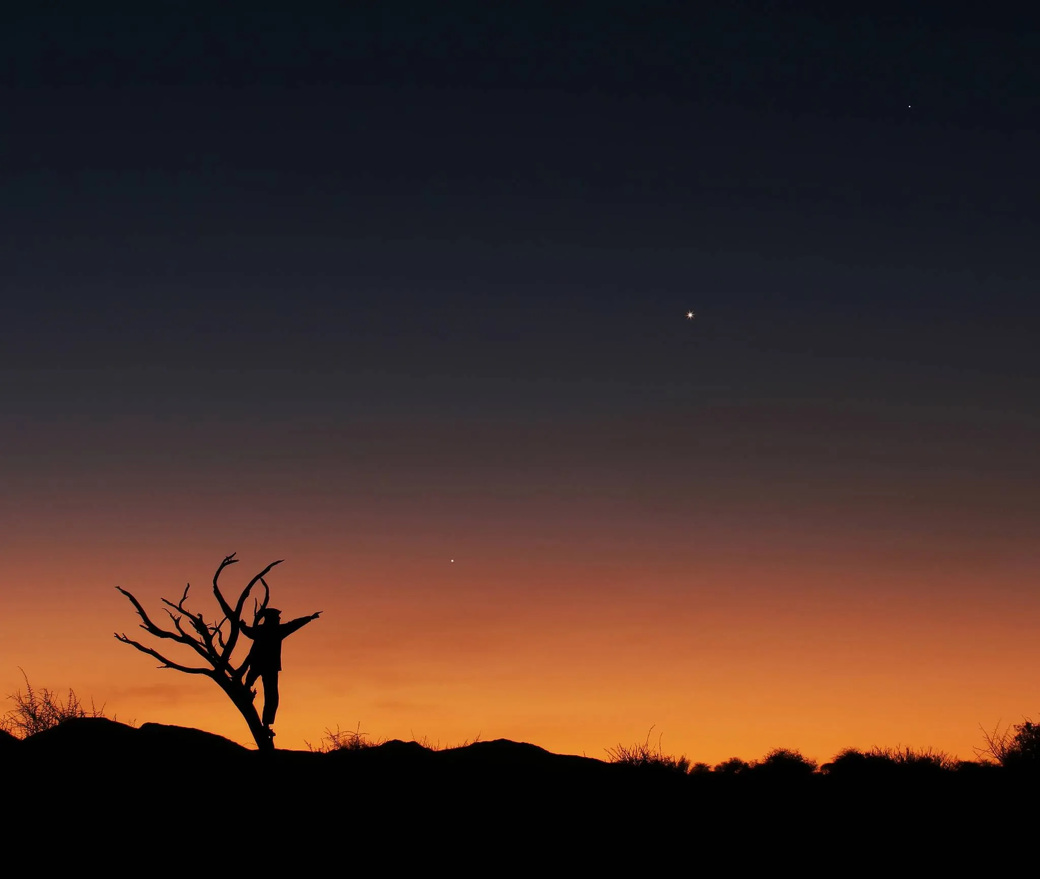 Three Planets in Conjunction by Lóránd Fényes (Hungary). The staggering colours of the sunset and flora of the African savannah afford a unique background for the planetary alignment of Jupiter, Venus and Mercury in June 2013. The golden hues of the sunrise, the three planets appeared as if they were strung on an invisible thread, and the bare tree and the human figure interwoven both point to one direction: Jupiter. (Photo by Lóránd Fényes)