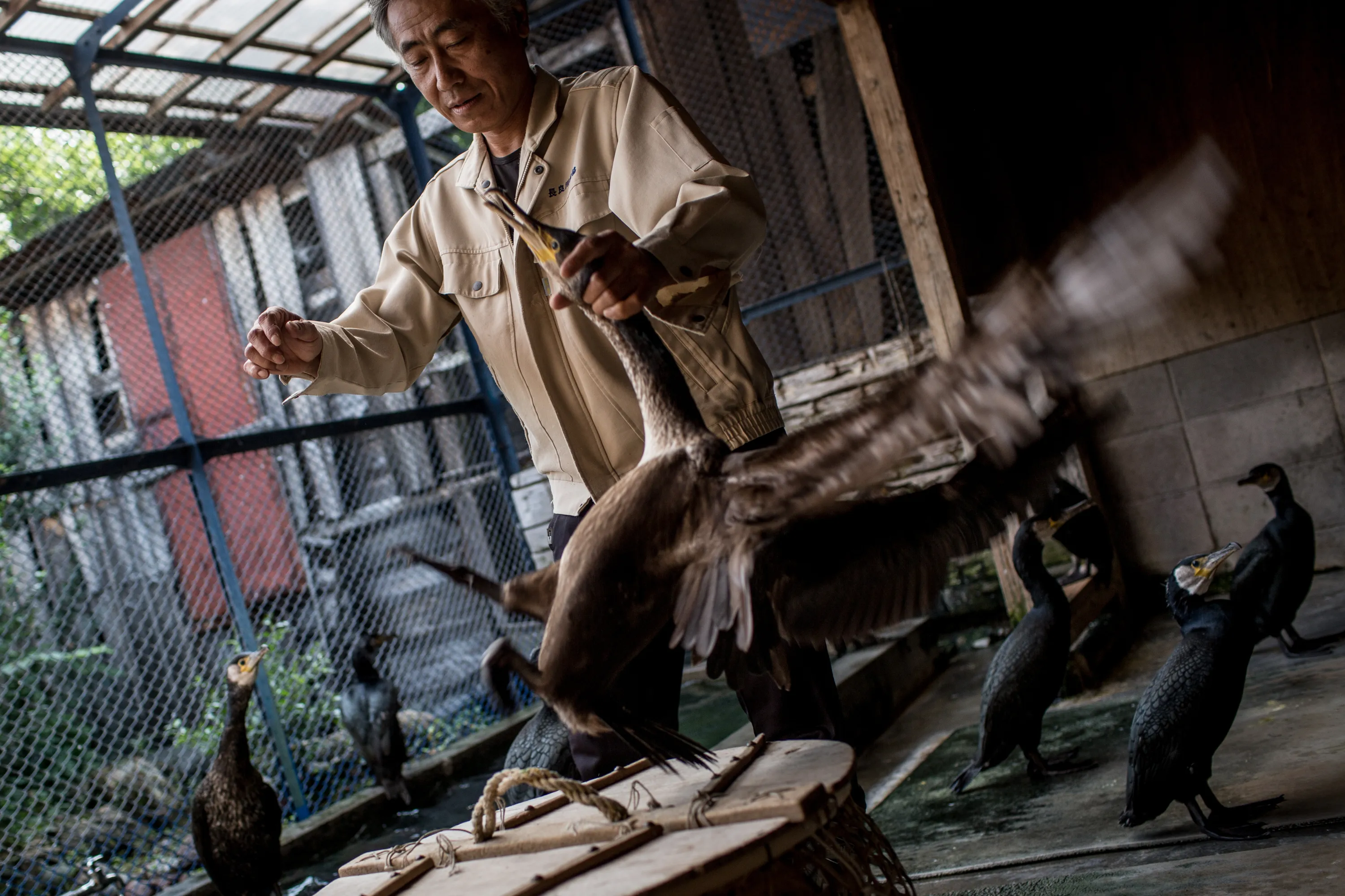 Cormorant master, Mr. Masahiko Sugiyama chooses his cormorants for the nights “Ukai” on July 2, 2014 in Gifu, Japan. In this traditional fishing art “ukai”, a cormorant master called “usho” manages cormorants to capture ayu or sweetfish. The ushos of River Nagara have been the official staff of the Imperial Household Agency of Japan since 1890. Currently six imperial fishermen of Nagara River conduct special fishing to contribute to the Imperial family eight times a year, on top of daily fishing from mid-May to mid-October. (Photo by Chris McGrath/Getty Images)