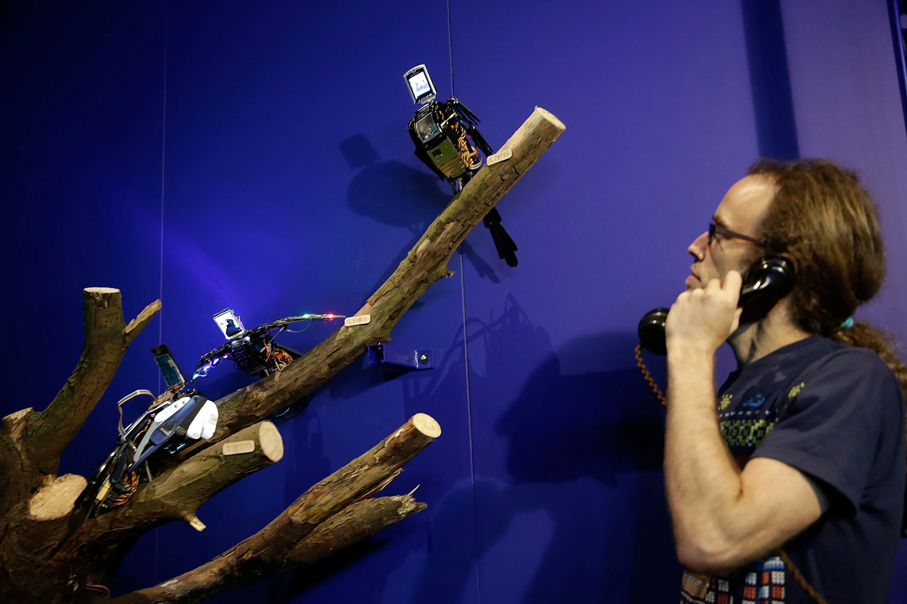 LONDON, ENGLAND - JULY 02: Unwanted phones recreated as interactive birds, part of "Escape III" by Anthony Goh and Neil Mendoza seen on display at the Barbican's Digital Revolution exhibition on July 2, 2014 in London, England. The exhibition brings together artists, designers, film makers, musicians and architects who push the boundaries of creativity that digitial technology can offer, and runs from July 3 until September 14, 2014. (Photo by Matthew Lloyd/Getty Images for Barbican Art Gallery)