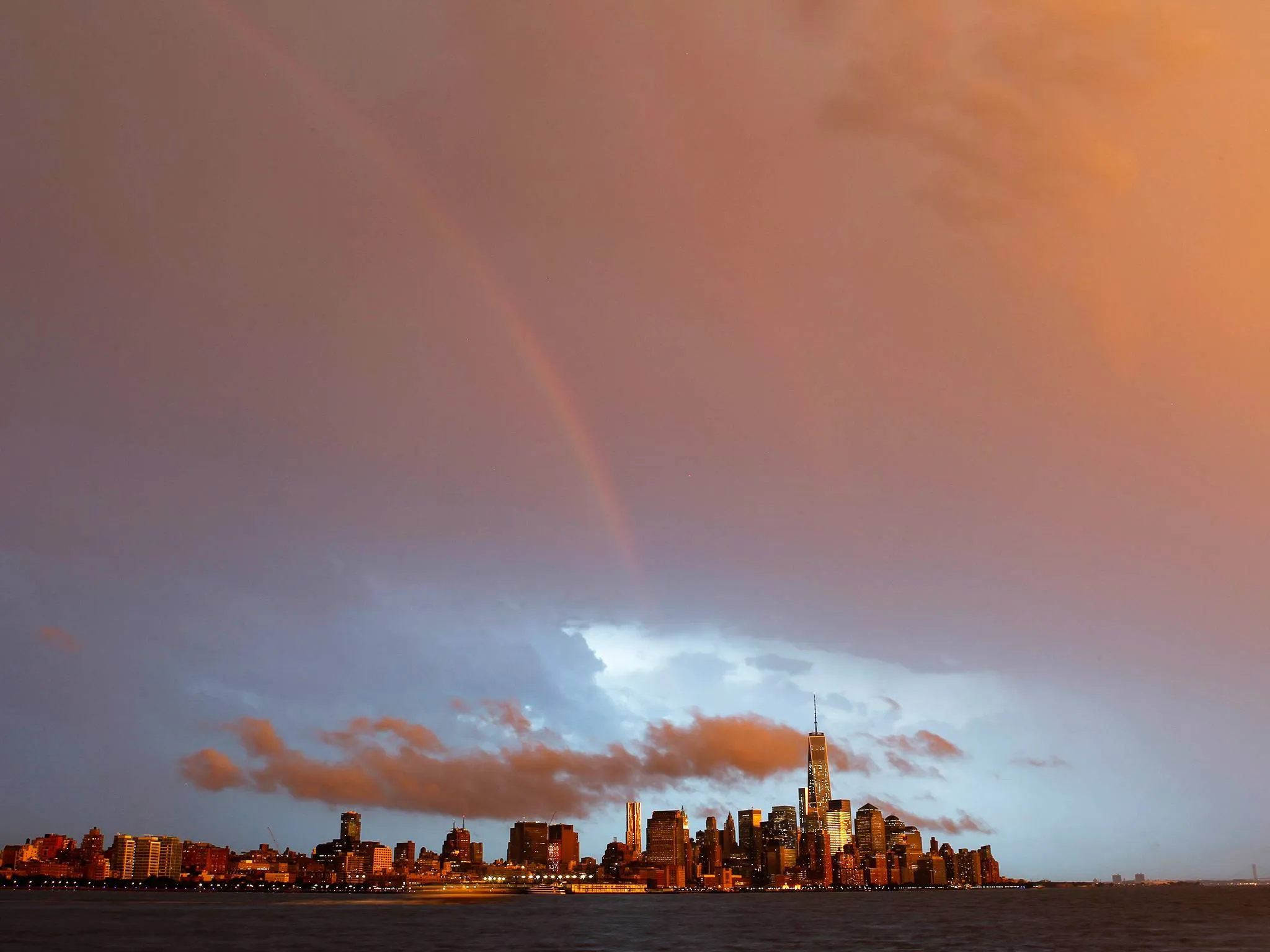 A rainbow forms over Lower Manhattan during an early evening storm in New York, July 2, 2014. (Photo by Gary Hershorn/Corbis Images)