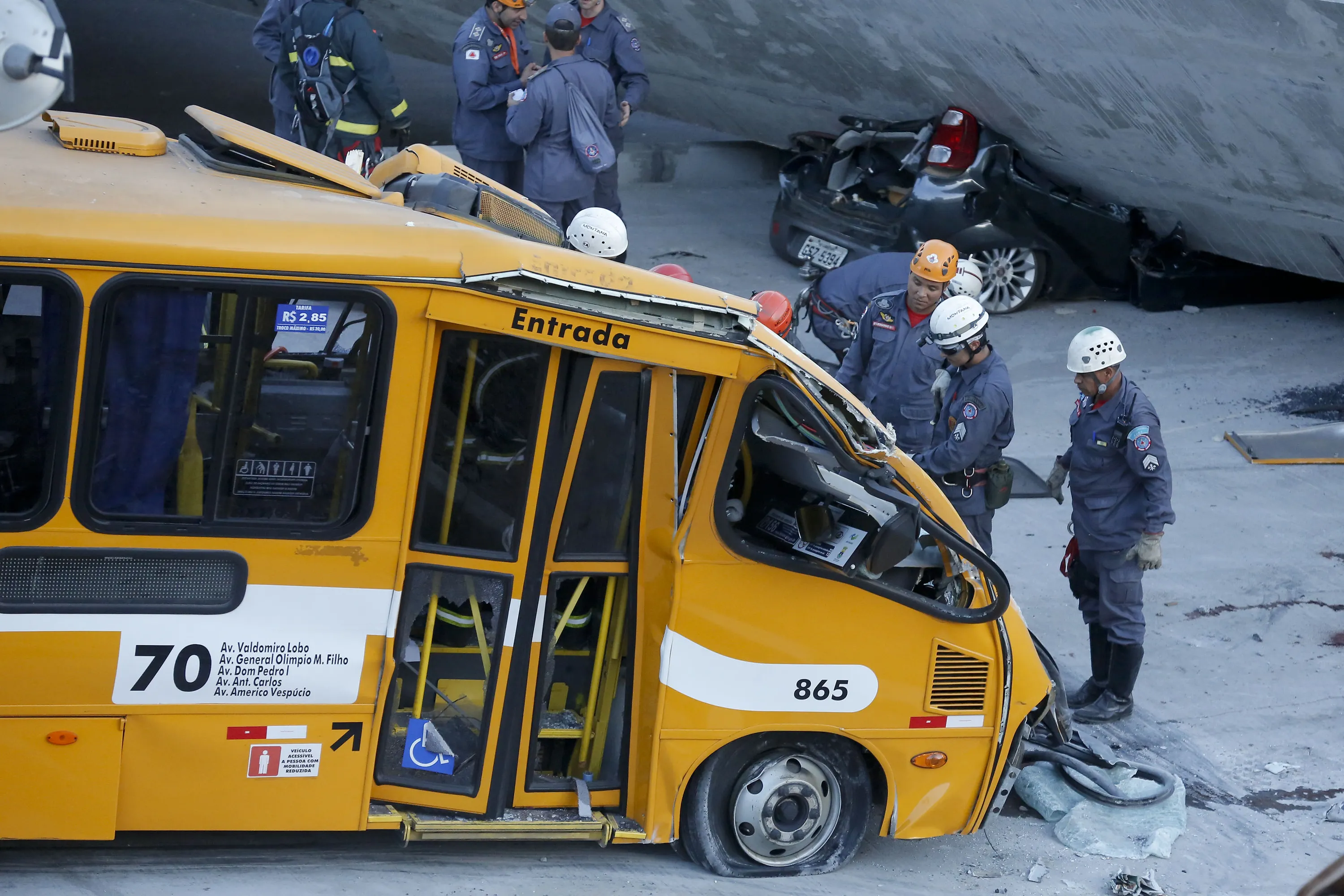 Fire department personnel work to retrieve a body from a bus after retrieving it from underneath a collapsed bridge in Belo Horizonte, Brazil, Thursday, July 3, 2014. The overpass under construction collapsed Thursday in the Brazilian World Cup host city. The incident took place on a main avenue, the expansion of which was part of the World Cup infrastructure plan but, like most urban mobility projects related to the Cup, was not finished on time for the event. (Photo by Victor R. Caivano/AP Photo)