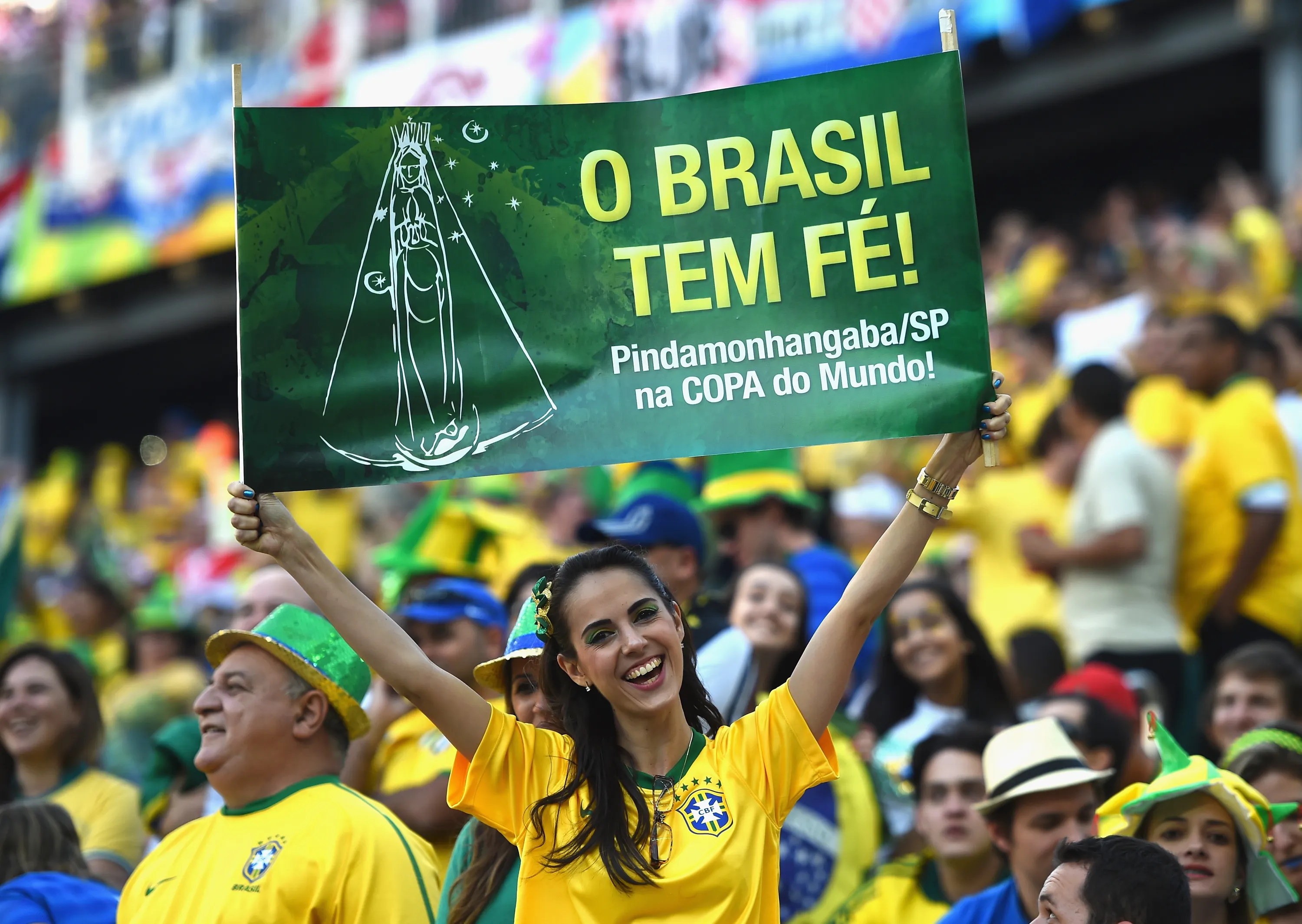 A Brazil fan holds up a sign during the 2014 FIFA World Cup Brazil Group A match between Brazil and Croatia at Arena de Sao Paulo on June 12, 2014 in Sao Paulo, Brazil. The banner says, “Brazil has faith!” (Photo by Christopher Lee/Getty Images)