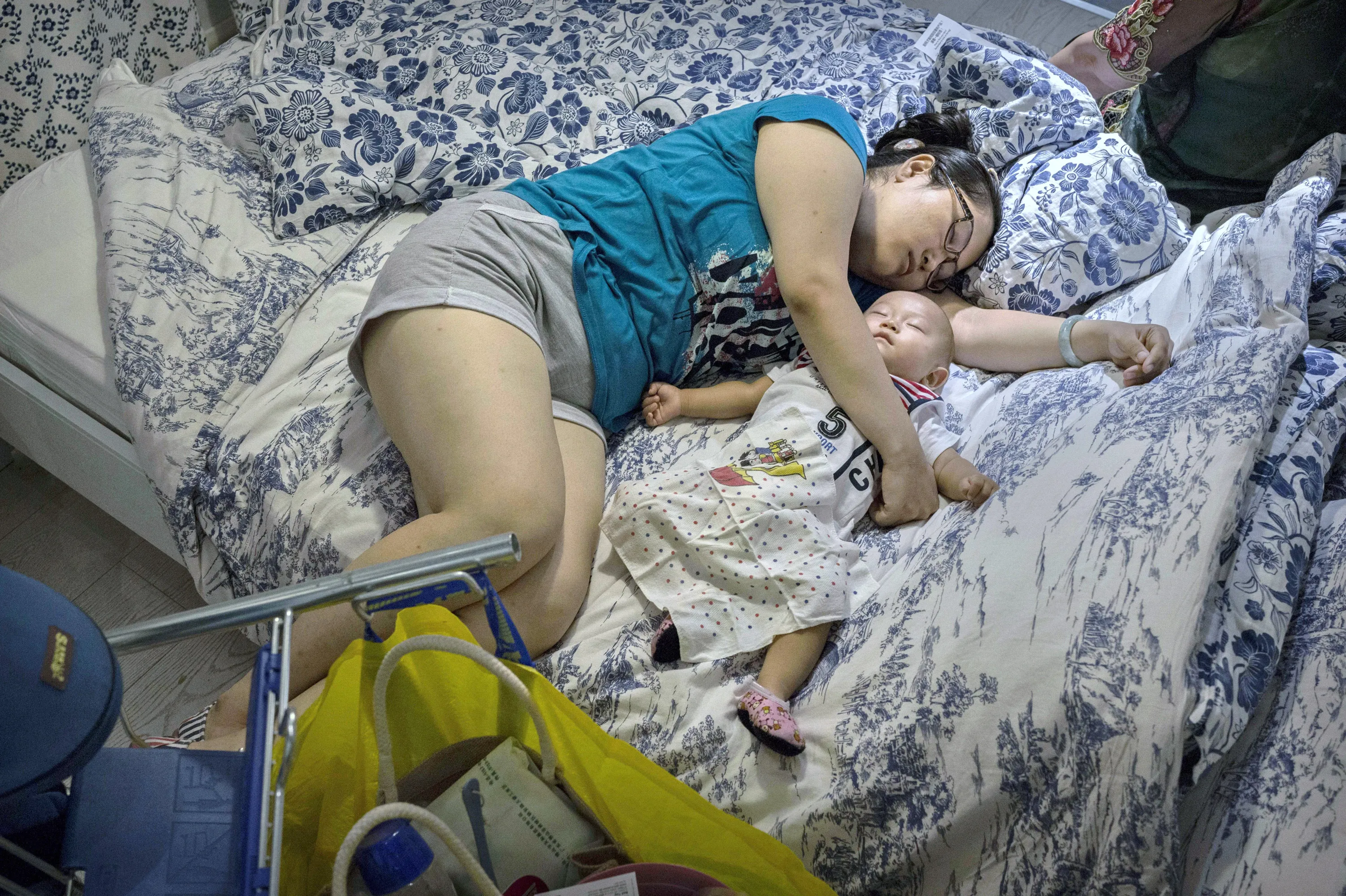 A Chinese shopper sleeps with her child on a bed in the showroom of the IKEA store on July 6, 2014 in Beijing, China. Of the world's ten biggest Ikea stores, 8 of them are in China to cater to the country's growing middle class. The stores are designed with extra room displays given the tendency for customers to make a visit an all-day affair. Store management does not discourage shoppers from sleeping on Ikea furniture, even marking them with signs inviting customers to try them out. (Photo by Kevin Frayer/Getty Images)