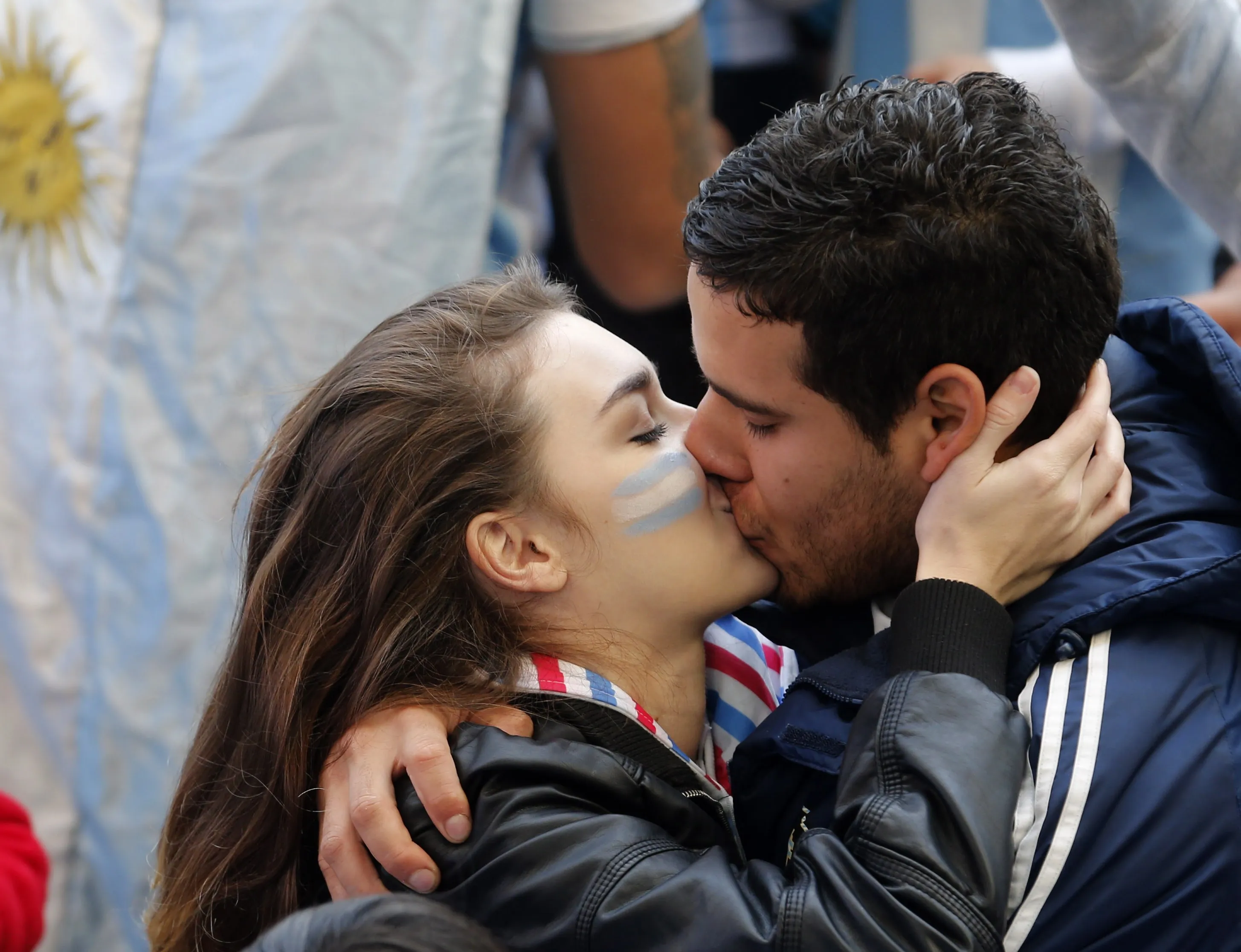 Argentina fans kiss as they wait for the team's World Cup semi-final soccer match against the Netherlands, at a public square viewing area in Buenos Aires July 9, 2014. (Photo by Enrique Marcarian/Reuters)