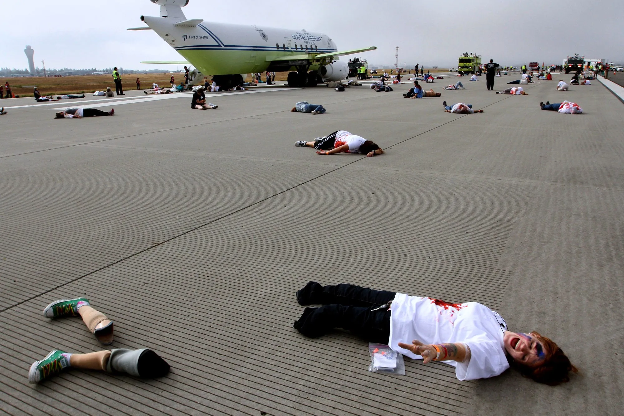 Genessa Faye of Seattle yells out, “Help me!” to responders to a mock airplane crash at SeaTac International Airport, Thursday, July 10, 2014. Approximately 300 volunteers took part in the mock crash site on the third runway at the airport. The volunteers were given clothes, makeup and a card which told him how badly they had been “injured” and instructed them how to act. Port of Seattle Fire Department ARRF vehicles responded from their positions on the east side of the airfield across taxiways and runways to the west side runway and mock aircraft. (Photo by Ellen M. Banner/AP Photo/The Seattle Times)