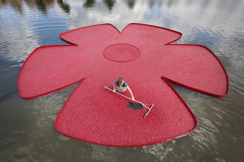 New England cranberry farmer Adrienne Mollor arranges a rose shaped floating display full of cranberries at the Hampton Court Palace Flower Show on July 7, 2014 in London, England. Hampton Court Palace Flower Show opens to the public tomorrow and runs until July 13, 2014. It is the world's largest flower show with over 600 exhibitors spread over 34 acres. (Photo by Peter Macdiarmid/Getty Images)