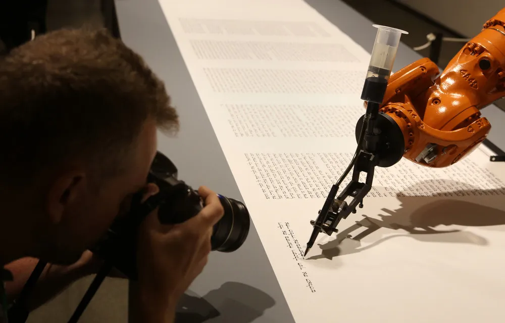 A photographer takes a picture of an industrial robot, an installation work called “bios [torah]” by the artist group robotlab, as it begins writing a Torah in the Jewish Museum in Berlin, Germany, on Jule 10, 2014. At the speed of a human, the robot writes a total of 304,805 Hebrew letters on an 80-meter roll of paper. The finished scroll will not be considered halakhic, or meeting the requirements for use for religious purposes. (Photo by Adam Berry/Getty Images)