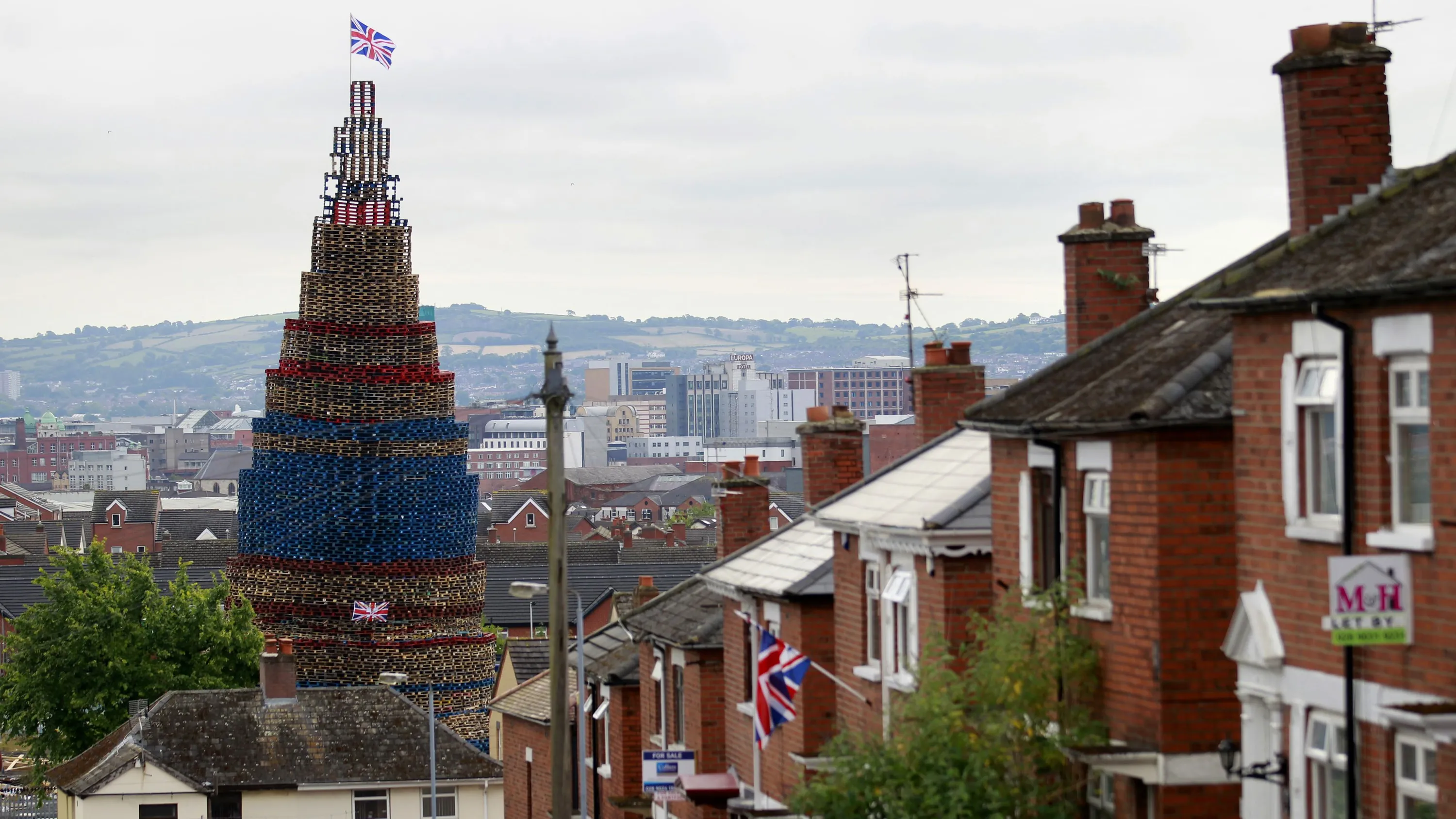 A massive loyalist bonfire dwarfs the houses near by in the Shankill area of West Belfast, Northern Ireland, Thursday, July 10, 2014. Thousands of bonfires have been built in Protestant areas across Northern Ireland that will be lit on the 11th Night referring to the night before the 12th of July, an annual Protestant commemoration of the 1690 Battle of the Boyne. (Photo by Peter Morrison/AP Photo)