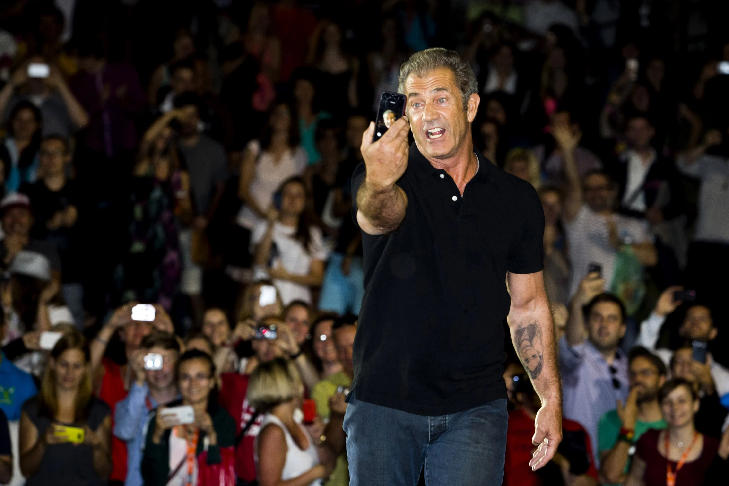 Actor Mel Gibson takes selfie as he puts on outdoor screening of “Mad Max” film during the 49th Karlovy Vary International Film Festival (KVIFF) on July 4, 2014 in Karlovy Vary, Czech Republic. (Photo by Matej Divizna/Getty Images)