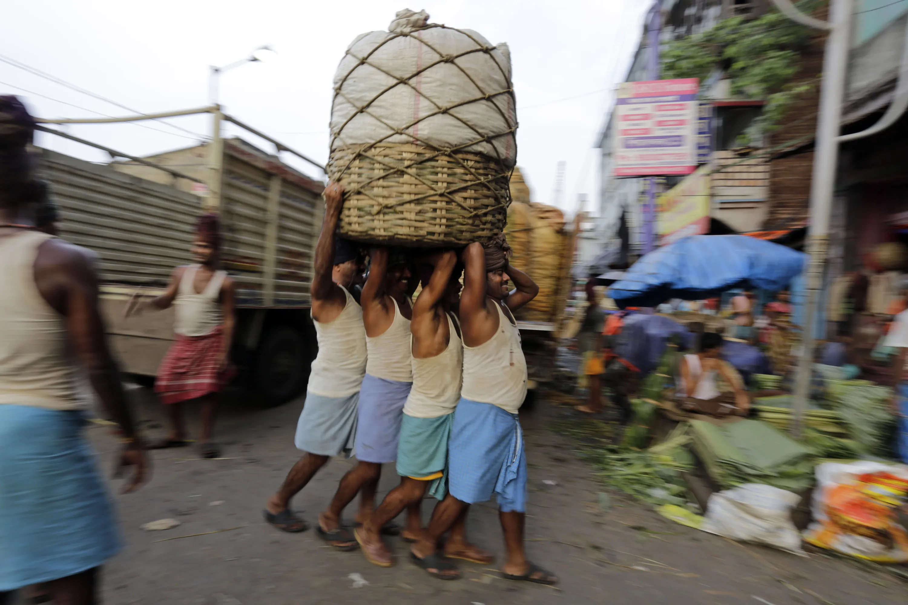 Indian laborers carry a load pf vegetables at a wholesale market in Kolkata, india, Wednesday, July 9, 2014. India's new government presents its inaugural budget this week in the first substantive test of whether Prime Minister Narendra Modi will deliver on ambitious promises to revive stalled economic growth. India's economic growth has slowed to less than 5 percent for the last two years after a decade of expanding by an average of 8 percent, which is the minimum the government says is necessary to provide jobs for the 13 million young Indians who enter the workforce each year. (Photo by Bikas Das/AP Photo)