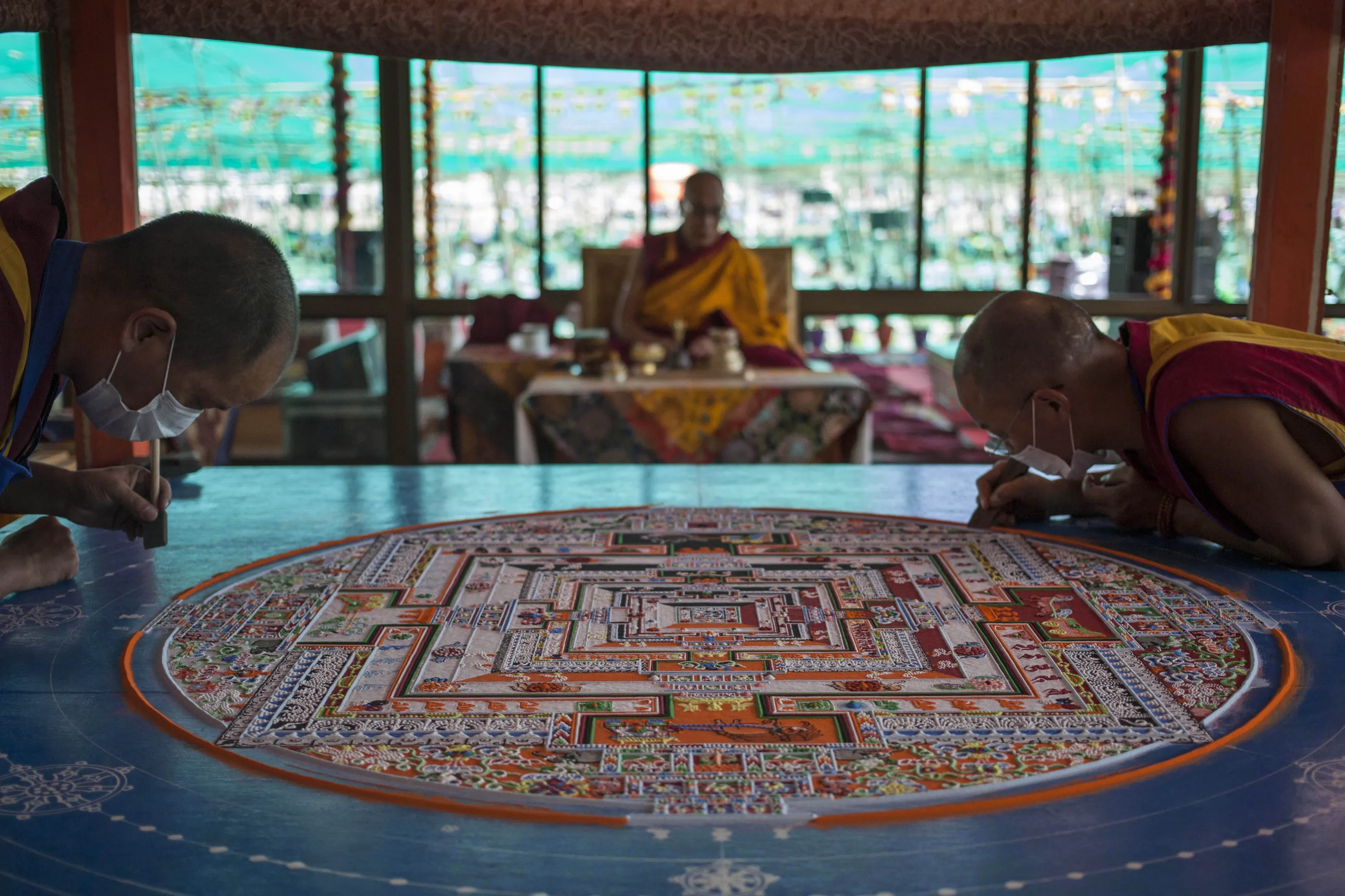 Buddhist monks prepare a Sand Mandala, a spiritual and ritual symbol depicting the Buddhist universe, as Tibetan spiritual leader the Dalai Lama is seated at the back on the fifth day of Kalachakra near Leh, India, Monday, July 7, 2014. Buddhist devotees from across the globe have arrived in this Himalayan region of Ladakh to attend the “Kalachakra” or Wheel of Time initiations by the Dalai Lama that began Thursday. (Photo by Tsering Topgyal/AP Photo)