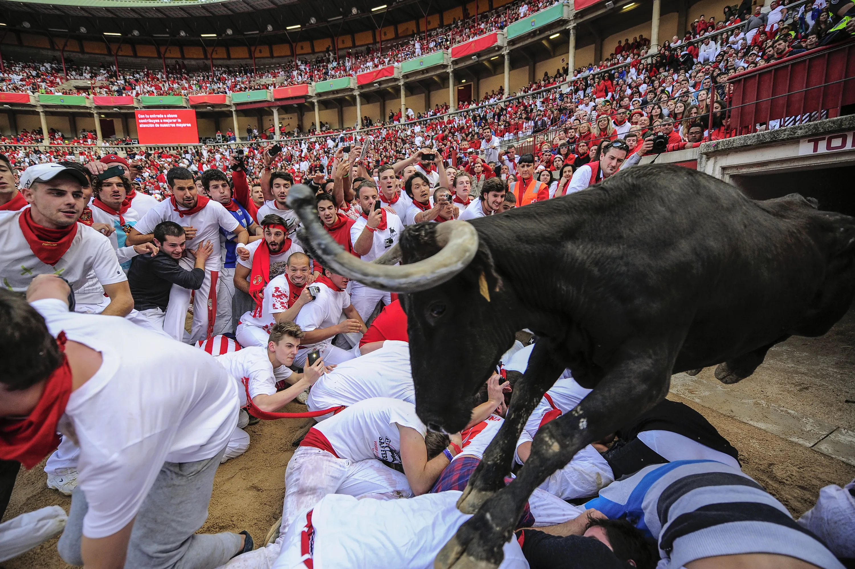 A cow jumps over revelers on the bull ring at the San Fermin festival, in Pamplona, Spain, Tuesday, July 8, 2014. Revelers from around the world in Pamplona take part in an eight-day event of the running of the bulls glorified by Ernest Hemingway's 1926 novel “The Sun Also Rises”. (Photo by Alvaro Barrientos/AP Photo)