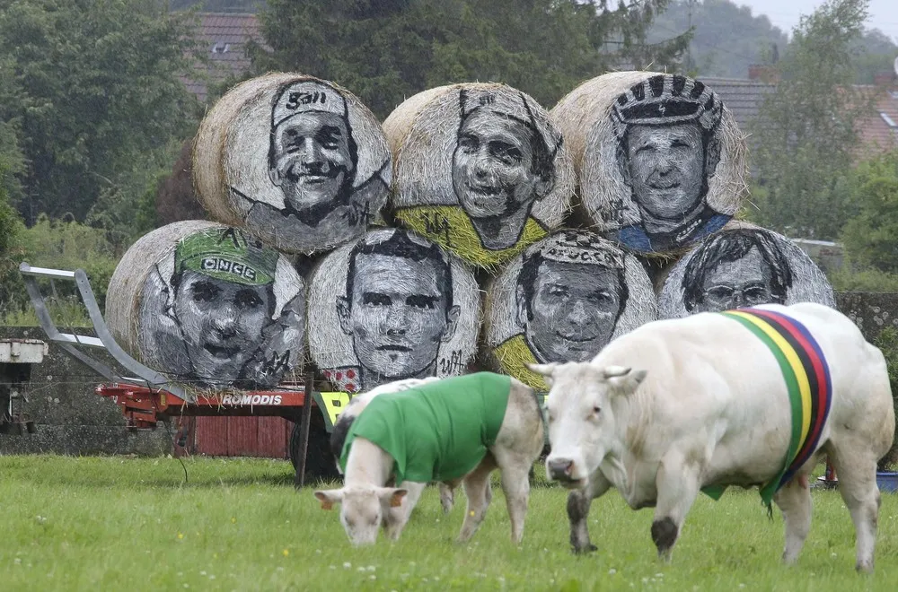 Cows, draped in the colours of the Tour de France cycling leaders jerseys, graze in a field near rolls of hay with the portraits of former champions along the route of the fifth stage of the Tour de France cycling race from Ypres in Belgium to Arenberg Porte du Hainaut in France, July 9, 2014. (Photo by Jacky Naegelen/Reuters)