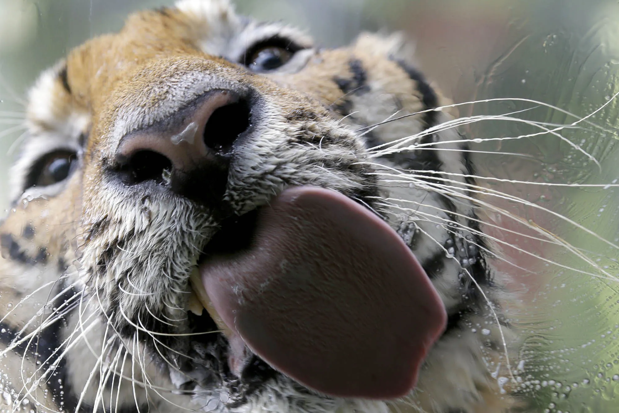 A Bengal tiger named “Pnoy” licks the glass cage as it takes a bath at Malabon Zoo Friday, July 11, 2014 at Malabon city, north of Manila, Philippines. (Photo by Bullit Marquez/AP Photo)