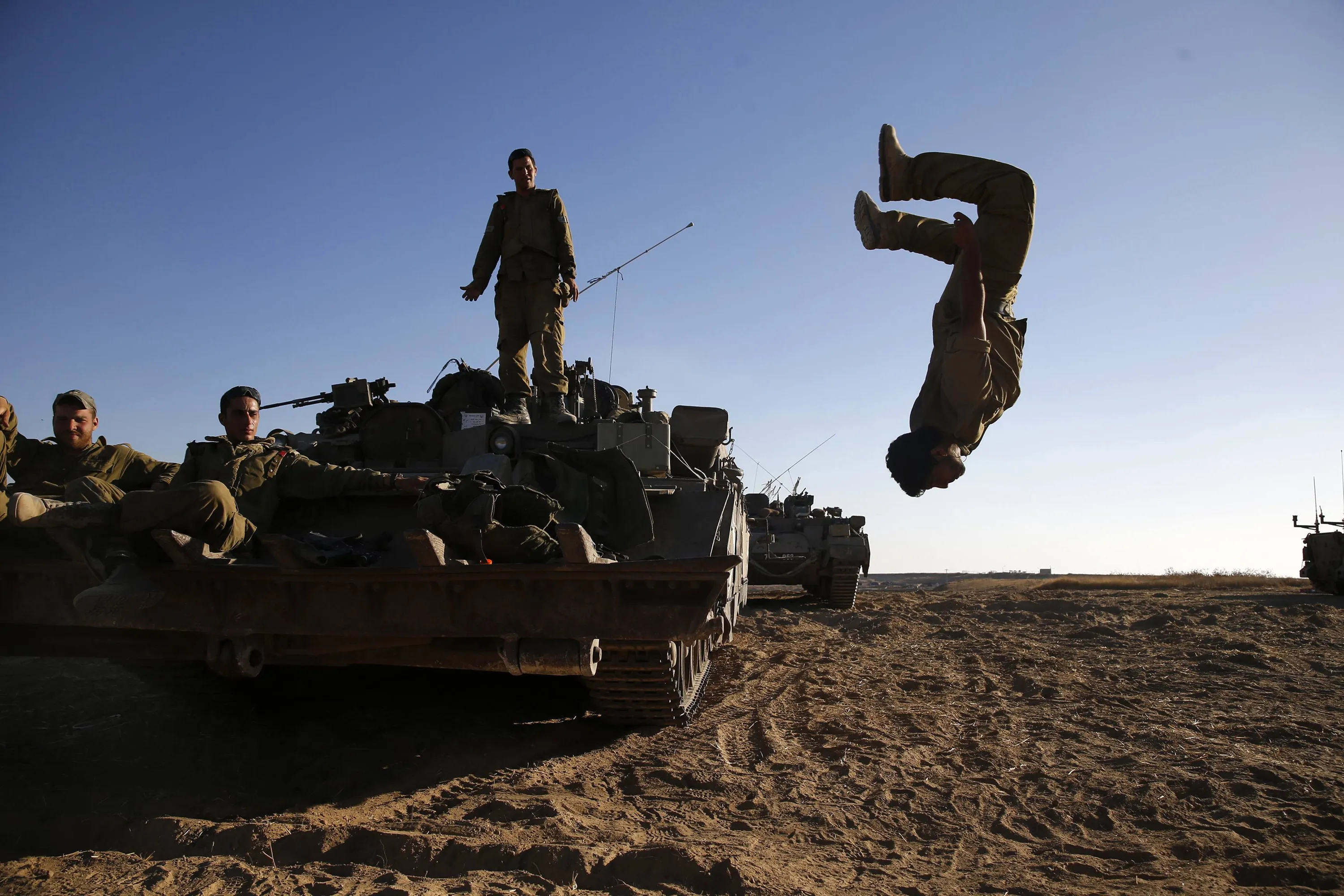 An Israeli soldier somersaults from an armoured personnel carrier (APC) stationed on a field outside the central Gaza Strip July 11, 2014. Prime Minister Benjamin Netanyahu said on Friday Israel has attacked more than 1,000 targets during a four-day-old offensive against Gaza militants and that “there are still more to go”. (Photo by Baz Ratner/Reuters)