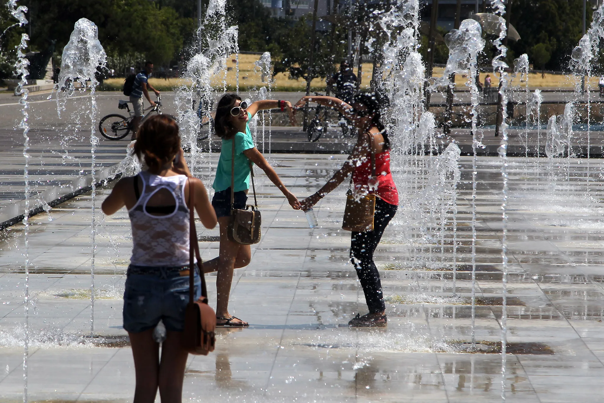 Tourists take photographs of themselves in the middle of water jets in a public fountain at the sea-front, in the northern Greek port of Thessaloniki, Monday, July 7, 2014. Temperatures are predicted to reach 36 degrees Celsius (96.8 Fahrenheit) in Greece. (Photo by Nikolas Giakoumidis/AP Photo)