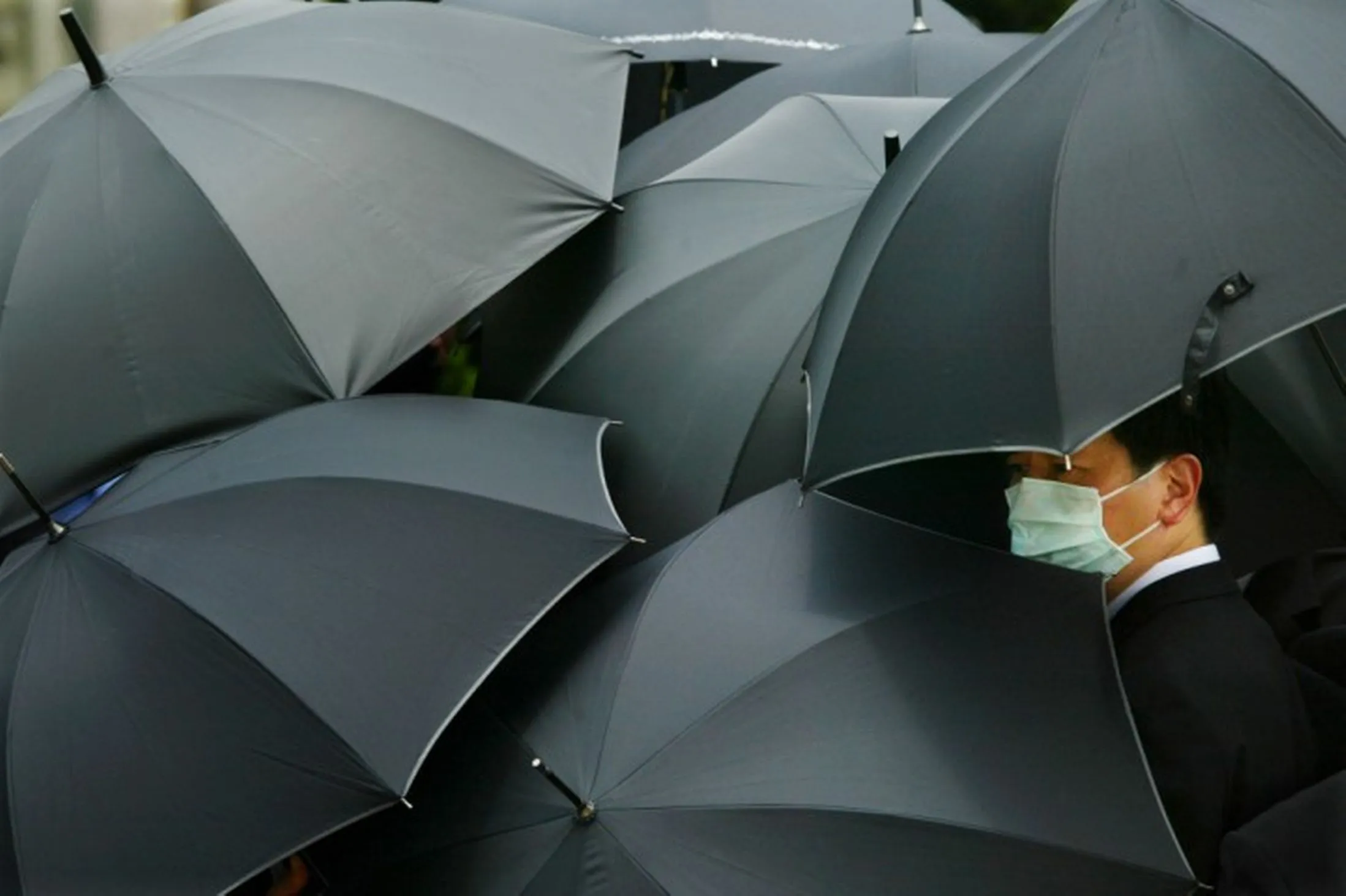 A mourner wearing a mask to ward off SARS hides under an umbrella during the funeral of SARS doctor Tse Yuen-man in Hong Kong. (Photo by Bobby Yip/Reuters)