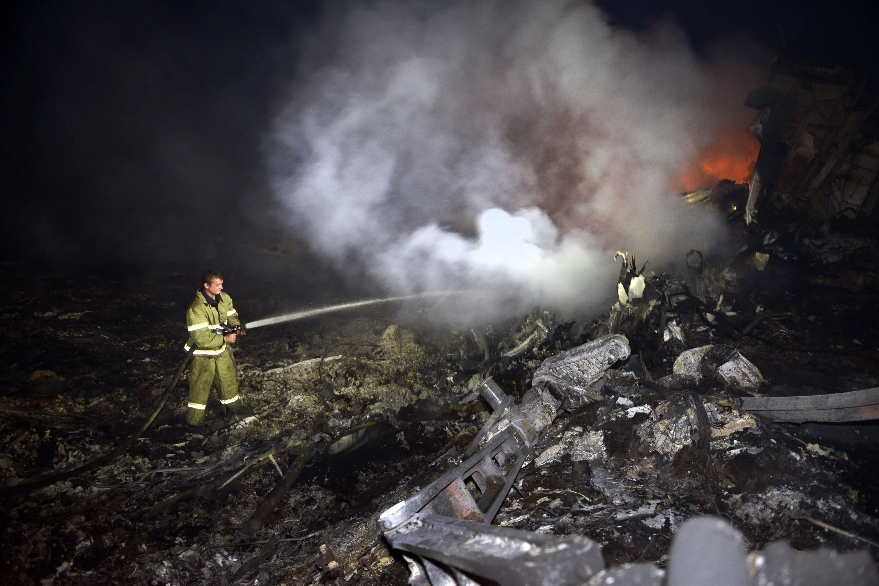 A firefighter sprays water to extinguish a fire, on July 17, 2014, amongst the wreckages of the malaysian airliner carrying 295 people from Amsterdam to Kuala Lumpur after it crashed, near the town of Shaktarsk, in rebel-held east Ukraine. Ukrainian President Petro Poroshenko said on Thursday that the Malaysia Airlines jet that crashed over rebel-held eastern Ukraine may have been shot down. “We do not exclude that the plane was shot down and confirm that the Ukraine Armed Forces did not fire at any targets in the sky”, Poroshenko said in a statement posted on the president's website. (Photo by Alexander Khudoteply/AFP Photo)