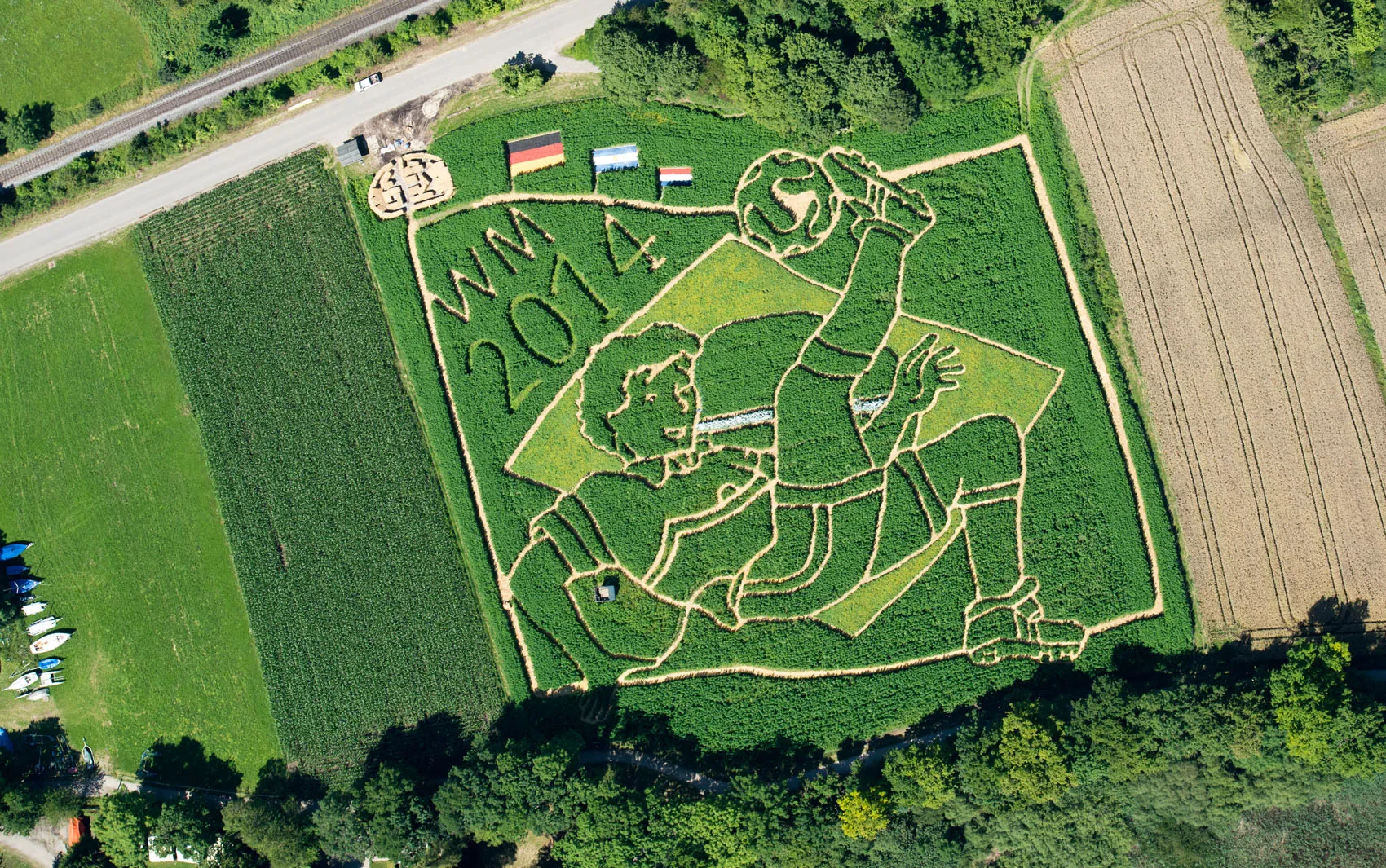 An aerial view taken on July 15, 2014 shows a field in football-design in Uttig, southern Germany. A labyrinth carved in the field shows a footballer making a bicycle kick on the flag of the 2014 Football World Cup host country Brazil as well as the flags of the winning nations (top, L-R) Germany (1st), Argentina (2nd) and The Netherlands (3rd). The field was created by farmers Uli and Corinne Ernst and their team since the sowing in April 2014 and consists of hemp, corn, rapeseed, sunflowers and common mallow. The giant greeting card to celebrate Germany's FIFA World Cup title measures 18,000 square meters, has an approximately three kilometers long labyrinth and is open for visitors from July 17 to September 28, 2014. (Photo by Peter Kneffel/AFP Photo/DPA)