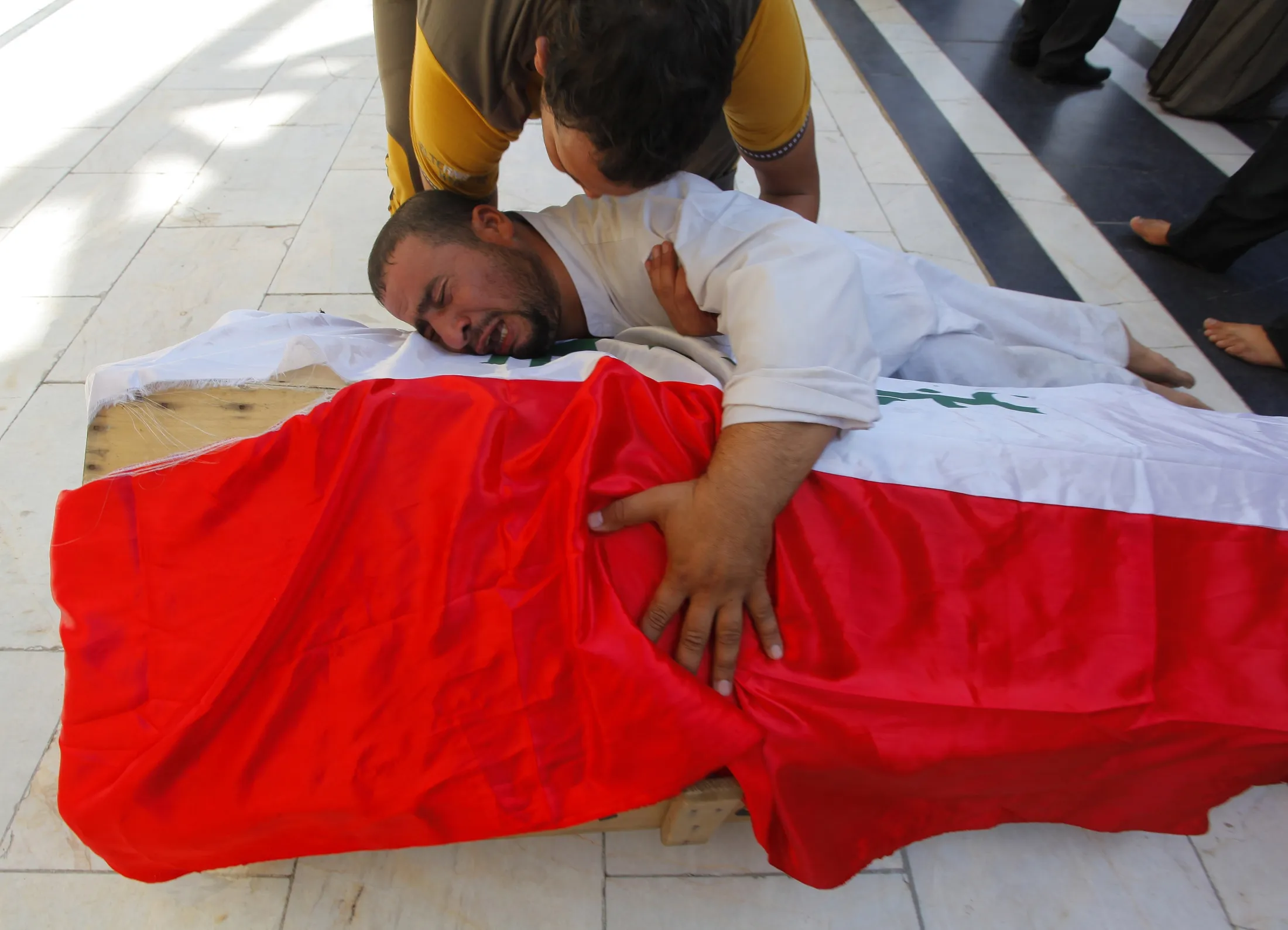 A man mourns on the coffin of Salah al-Wa'ili, a fighter from the Iraqi Shi'ite group Asa'ib Ahl al-Haq, during his funeral in Najaf July 12, 2014. Responding to an appeal from Shi'ite clerics, Wa'ili signed up earlier this month with the militia near Baghdad fighting the Islamist insurgents who have swept through northern Iraq and threatened the capital. A week later the 27-year-old part-time fighter was dead. Killed in battle against Sunni militants near the western city of Ramadi on Friday, he joined the growing list of casualties from the latest wave of conflict to strike Iraq, which has been plagued by war, sanctions and sectarian strife for longer than Wa'ili's brief lifetime. Picture taken July 12, 2014. (Photo by Alaa Al-Marjani/Reuters)