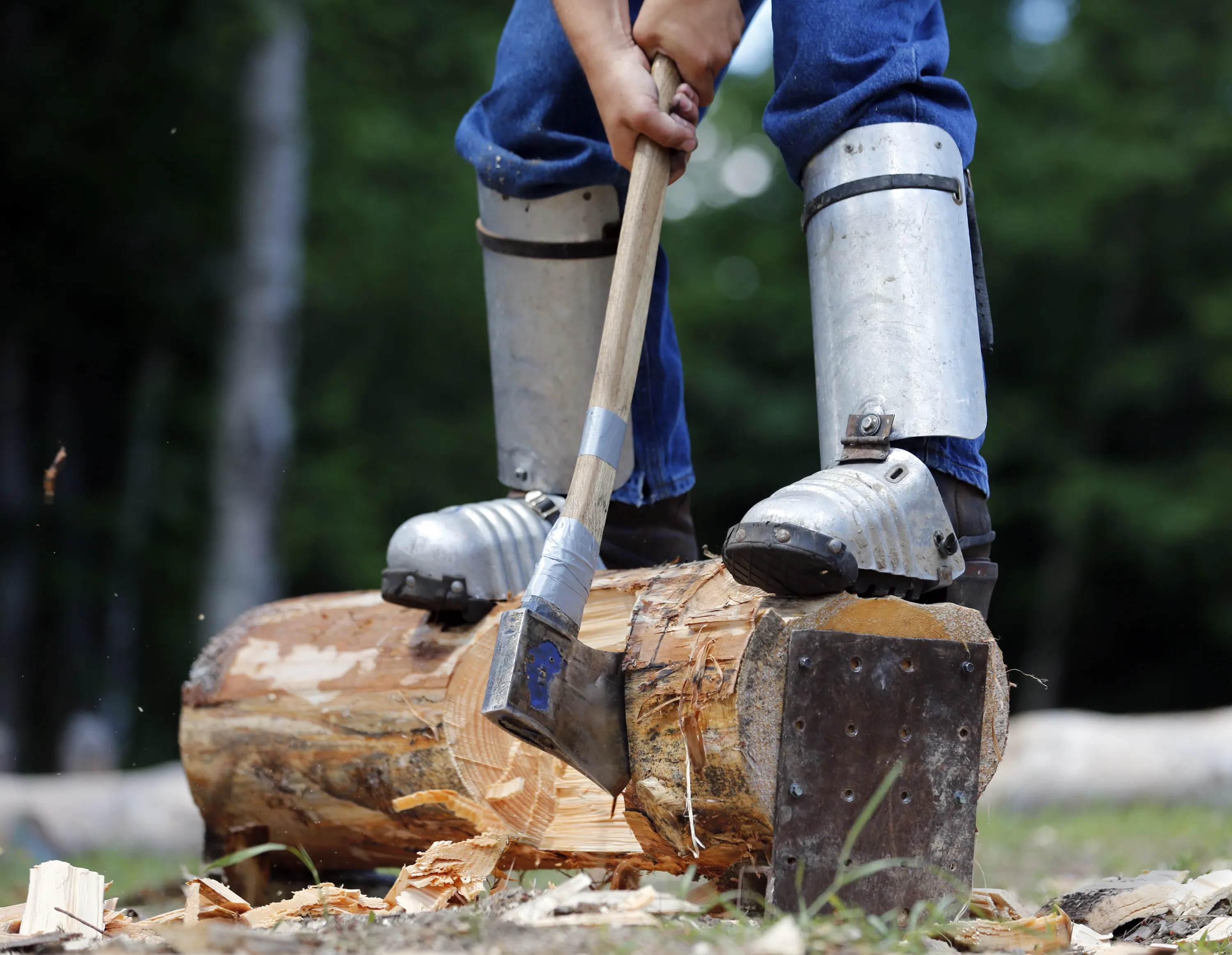 In this July 10, 2014 photo, Chris Minore, of Orange, Conn., performs the under chop technique at the Adirondack Woodsmen's School at Paul Smith's College in Paul Smiths, N.Y. Eighteen young students in matching gray sports shirts took part recently in a weeklong crash course on old-school lumberjack skills such as sawing, chopping, ax throwing, log boom running and pole climbing. (Photo by Mike Groll/AP Photo)