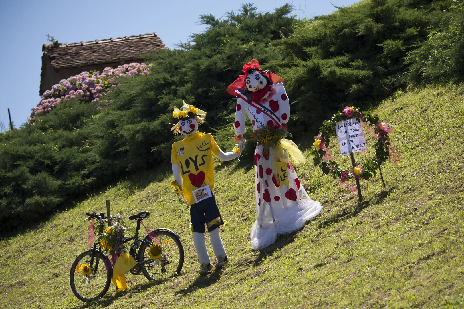Mannequins wearing the overall leader's yellow jersey and the best climber's polka dot jersey are displayed along the road during the 187.5 km eleventh stage of the 101st edition of the Tour de France cycling race on July 16, 2014 between Besancon and Oyonnax, eastern France. (Photo by Lionel Bonaventure/AFP Photo)