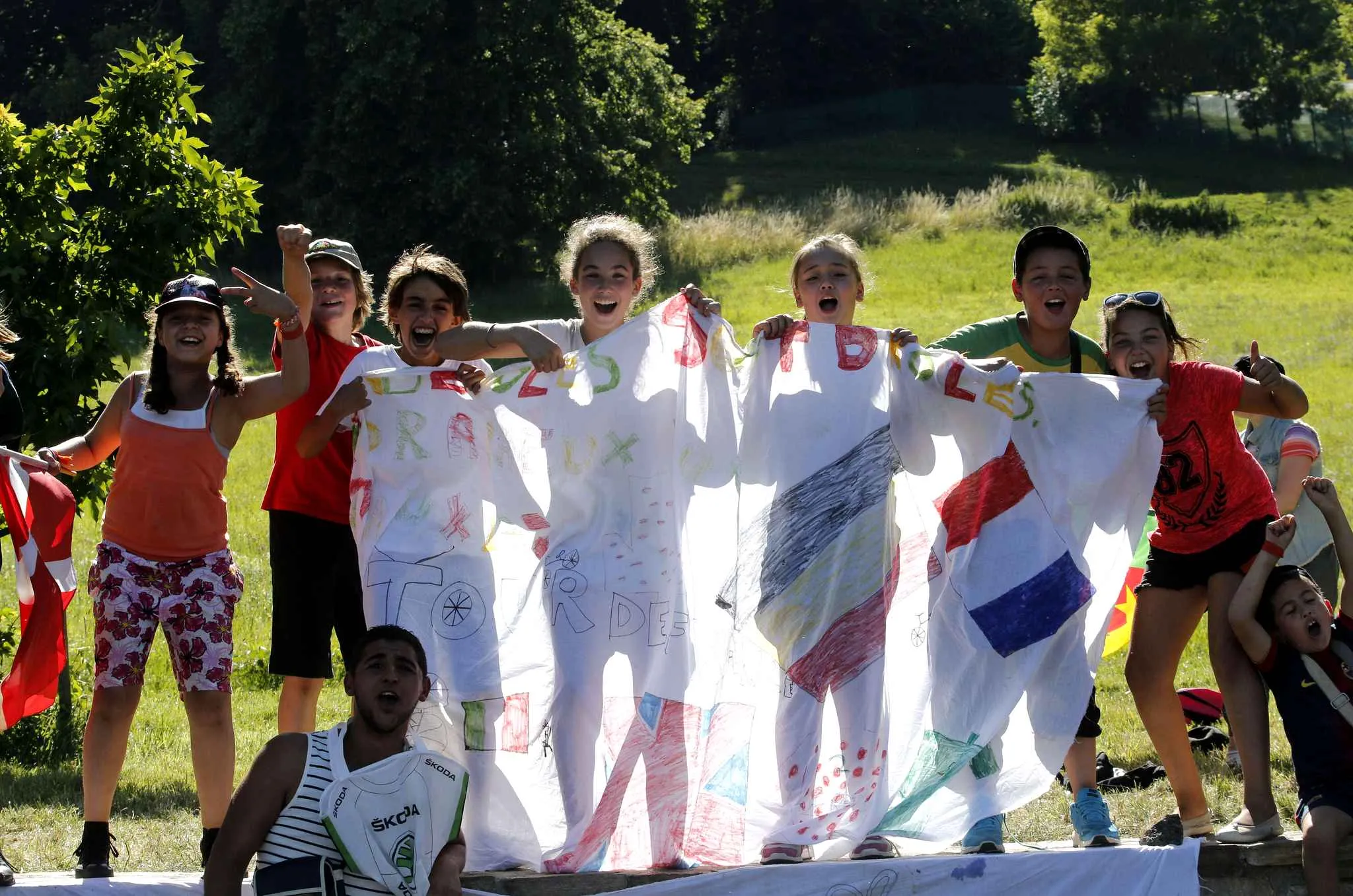 Children cheer as they wait for the riders to pass during the twelfth stage of the Tour de France cycling race over 185.5 kilometers (115.3 miles) with start in Bourg-en-Bresse and finish in Saint-Etienne, France, Thursday, July 17, 2014. (Photo by Christophe Ena/AP Photo)