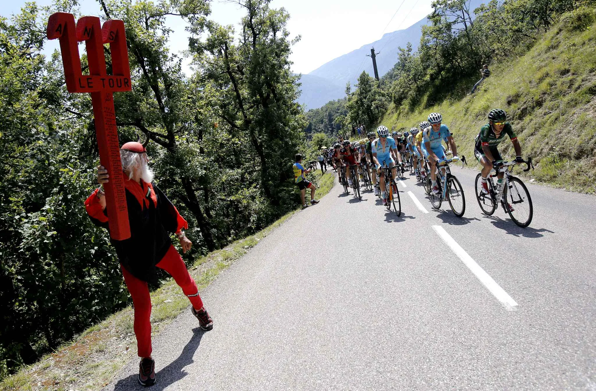Dieter “Didi” Senft of Germany, known as El Diablo, left, encourages the pack led by Japan's Yukiya Arashiro, right, as it climbs Palaquit pass during the thirteenth stage of the Tour de France cycling race over 197.5 kilometers (122.7 miles) with start in Saint-Etienne and finish in Chamrousse, France, Friday, July 18, 2014. (Photo by Christophe Ena/AP Photo)