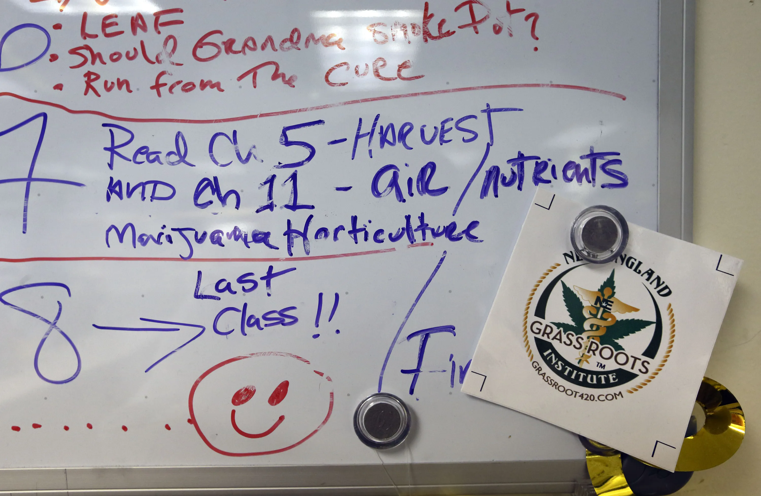 In this Thursday, July 10, 2014, photo, a white board displays cooking class information at the New England Grass Roots Institute in Quincy, Mass. The proliferation of marijuana edibles for medical and recreational use is giving rise to a cottage industry of foods, infused olive oils, cookbooks and classes as more states legalize marijuana use. Cooking classes have sprung up. One in Denver – led by a chef who has turned out chocolate-covered bacon and Swedish meatballs with a marijuana-infused glaze – has grown so popular that it will be offered every week in August. It's also part of a vacation package that provides pot tourists with a stay at a cannabis-friendly hotel (vaporizer and private smoke deck included), a visit to dispensaries and growing operations, and the cooking class. (Photo by Michael Dwyer/AP Photo)