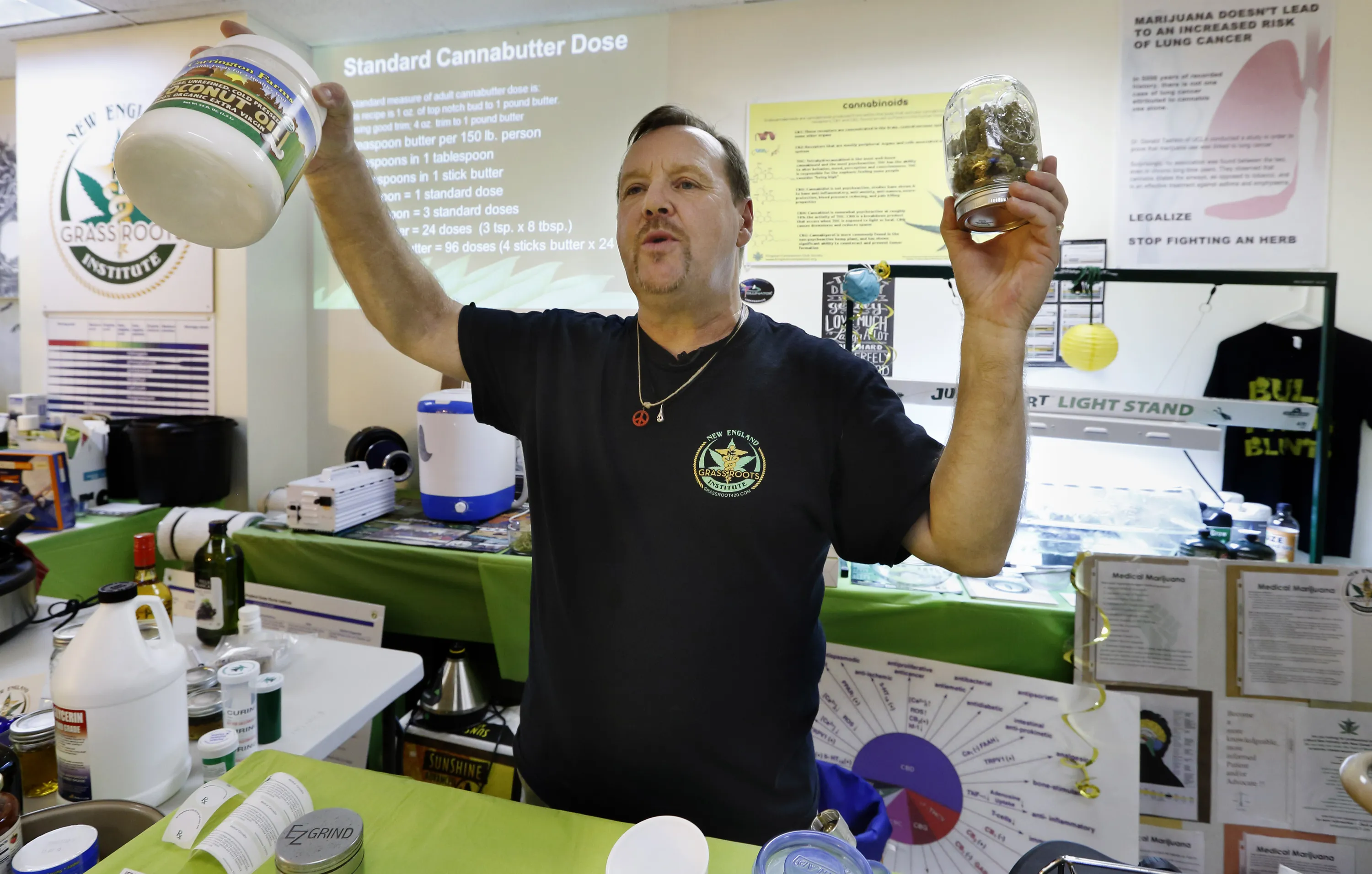 In this Thursday, July 10, 2014, photo, Mike Fitzgerald discusses how to prepare a cannabis-infused cooking oil during a cooking class at the New England Grass Roots Institute in Quincy, Mass. For many sick people, especially those with cancer, smoking marijuana is not a safe option, and some edibles can deliver a longer-lasting therapeutic dose that doesn’t give them a buzz. BlueKudu, in Denver, started producing marijuana chocolate bars for medicinal purposes three years ago. Since recreational use became legal this year in Colorado, owner Andrew Schrot said, the wholesale business has more than doubled its sales from several hundred chocolate bars sold a day through dispensaries to more than 1,000, at $9 to $17 a piece. (Photo by Michael Dwyer/AP Photo)
