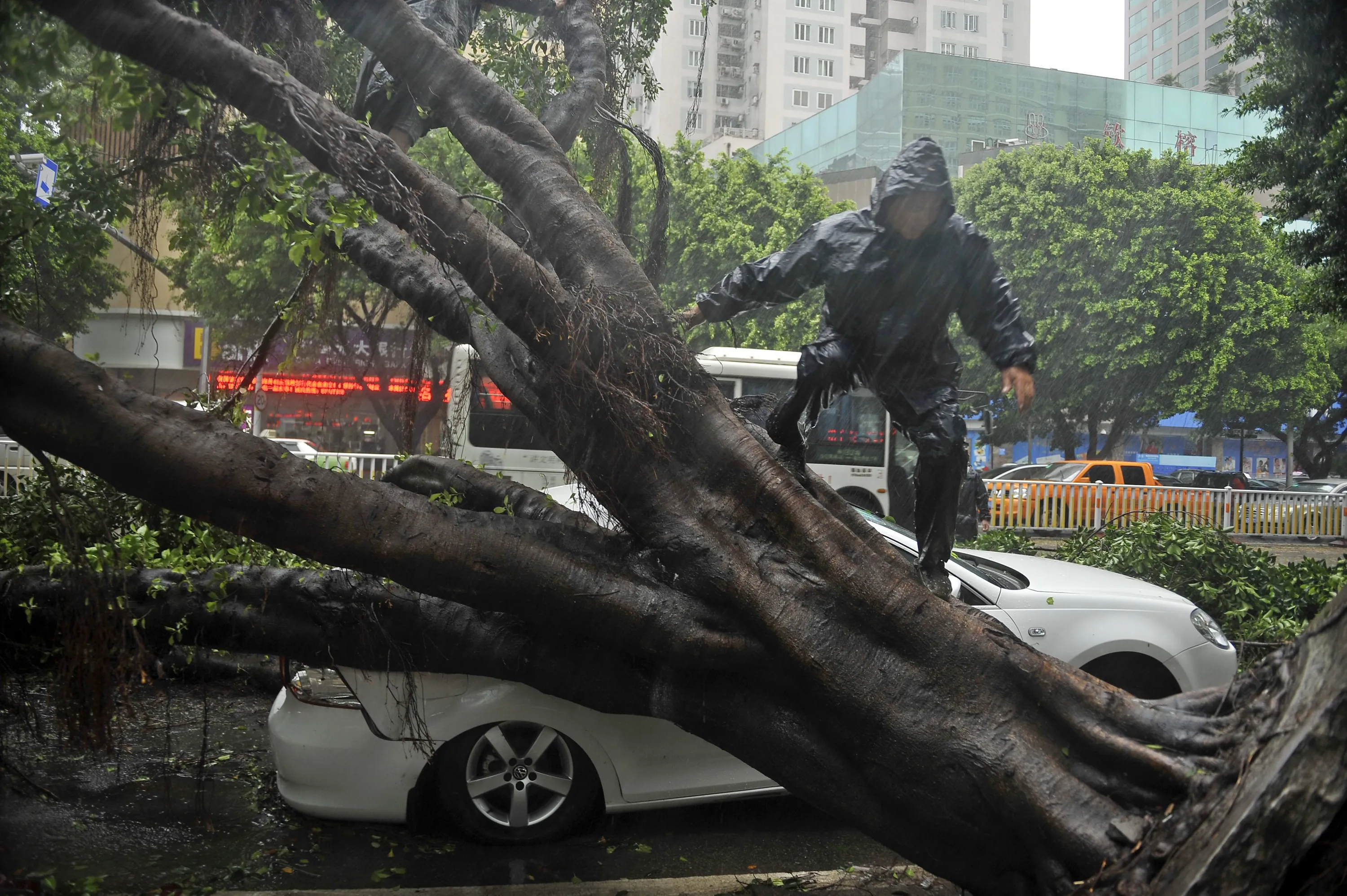 A worker climbs over a tree which fell on a car in a street in Fuzhou in southeast China's Fujian province 23 July 2014. Typhoon Matmo, the second to hit China in a week, landed in Fujian in the afternoon. (Photo by Liu Tao/EPA)