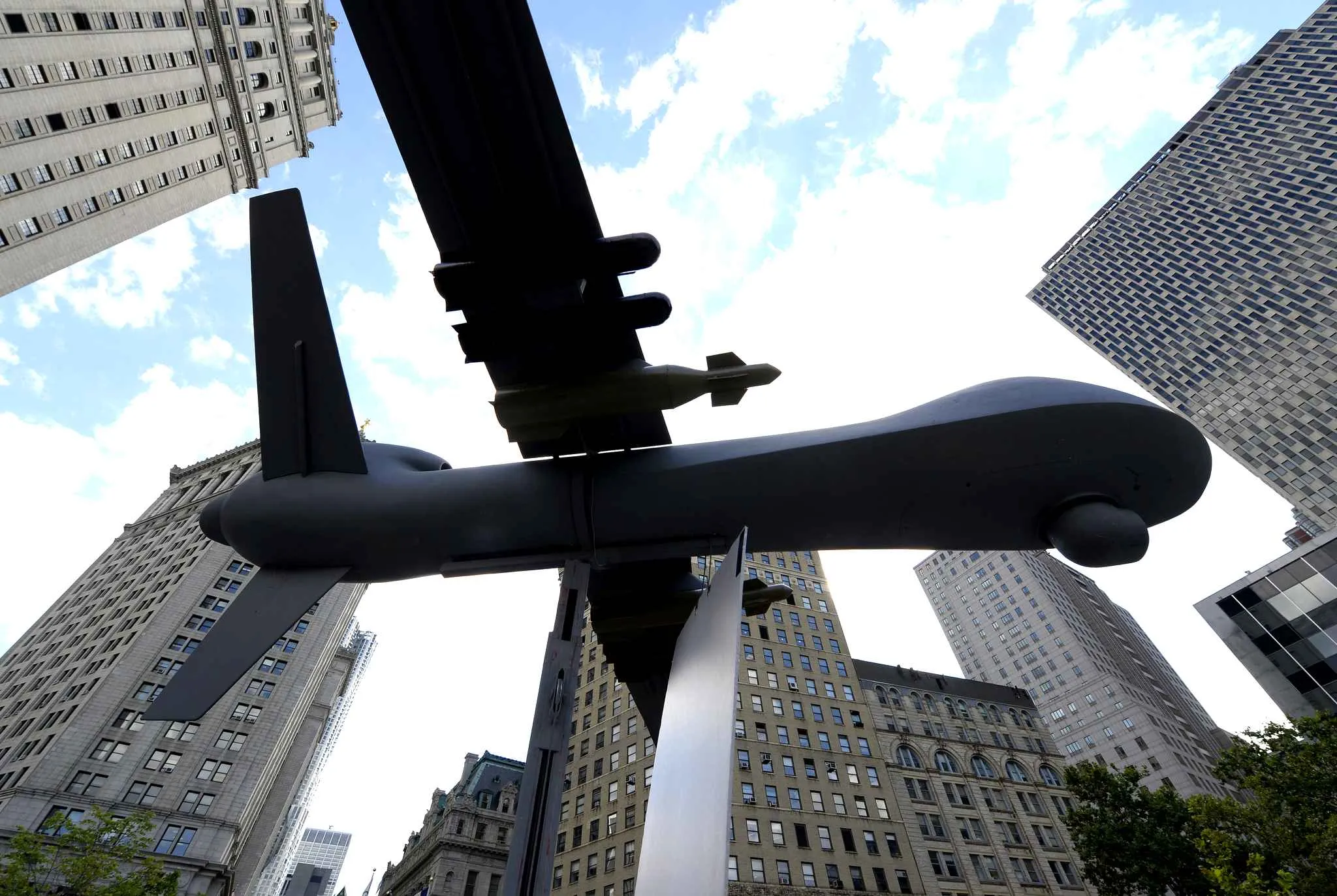 A model of a drone on display as New Yorkers gather to protest Israel’s military assault in Gaza during a rally at Foley Square July 24, 2014 where they will read aloud over hundred names of the Palestinian children that killed in Israel’s assault, before march through lower Manhattan. The protesters urge an end to the US government’s and New York City elected officials’ support for Israel’s current operation in Gaza, and calling for a boycott of the companies that supporting Israel’s human rights violations against Palestinians. (Photo by Timothy A. Clary/AFP Photo)