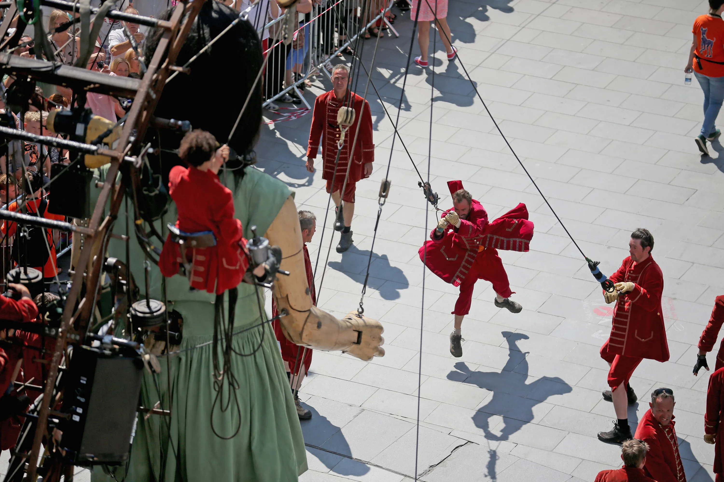 Puppeteers operate the The Little Giant Girl, one of the giant Royal De Luxe street puppets taking part in Liverpool's World War I centenary commemorations as she walks through the streets of Liverpool on July 25, 2014 in Liverpool, England. French street theatre company Royal de Luxe are putting on a show throughout the city as part of Liverpool's World War I centenary commemorations from July 23-27. The giant puppet grandmother has slept in the hall for two days as part of “Memories of August 1914”. As the giants tour the city the Little Girl Giant and her dog Xolo will meet up with the giant Grandmother telling the story of life leading up to World War One. (Photo by Christopher Furlong/Getty Images)