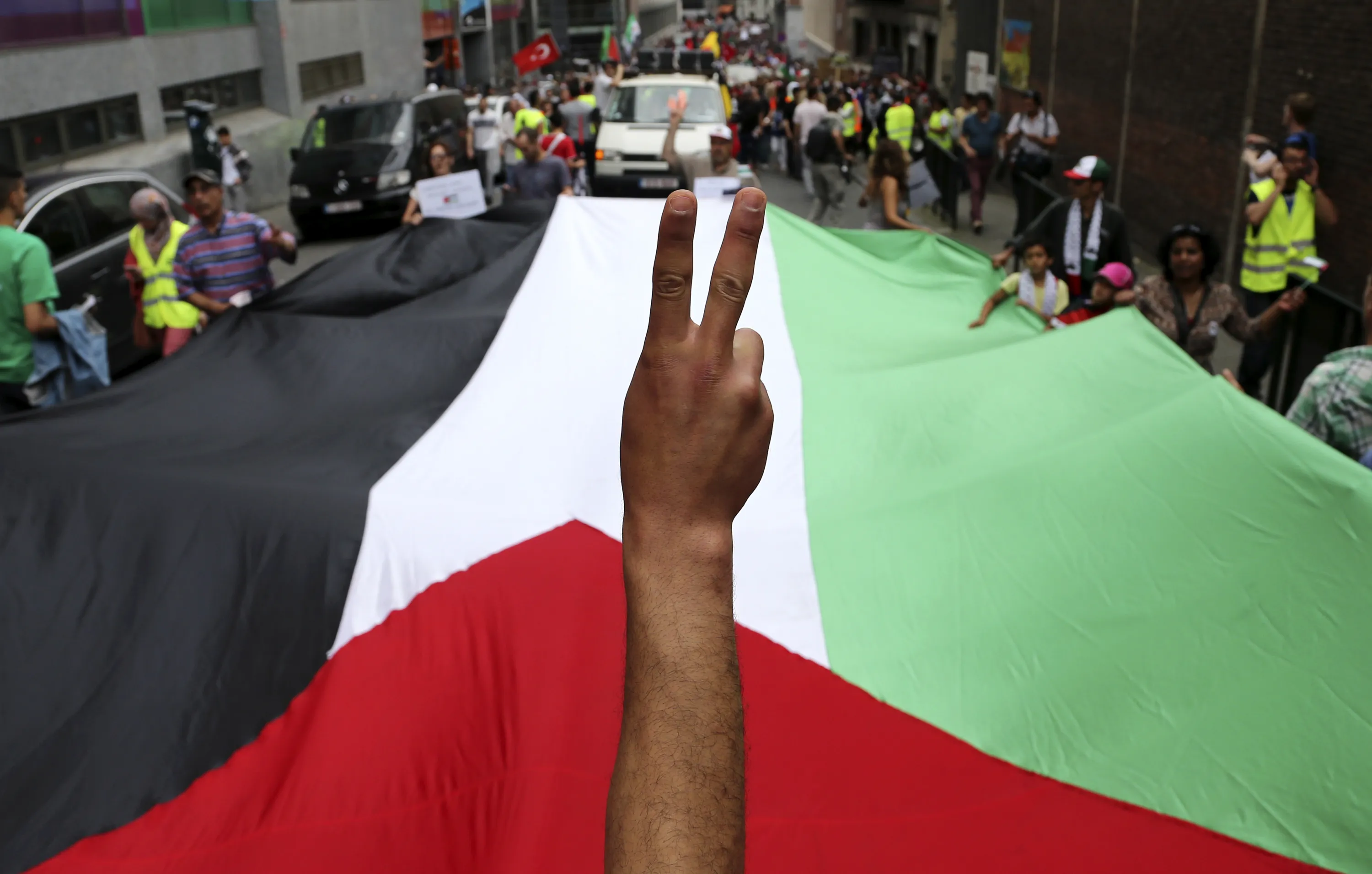 A demonstrator flashes a victory sign in front of a Palestinian flag during a protest against Israel's military action in Gaza, in central Brussels July 19, 2014. (Photo by Francois Lenoir/Reuters)