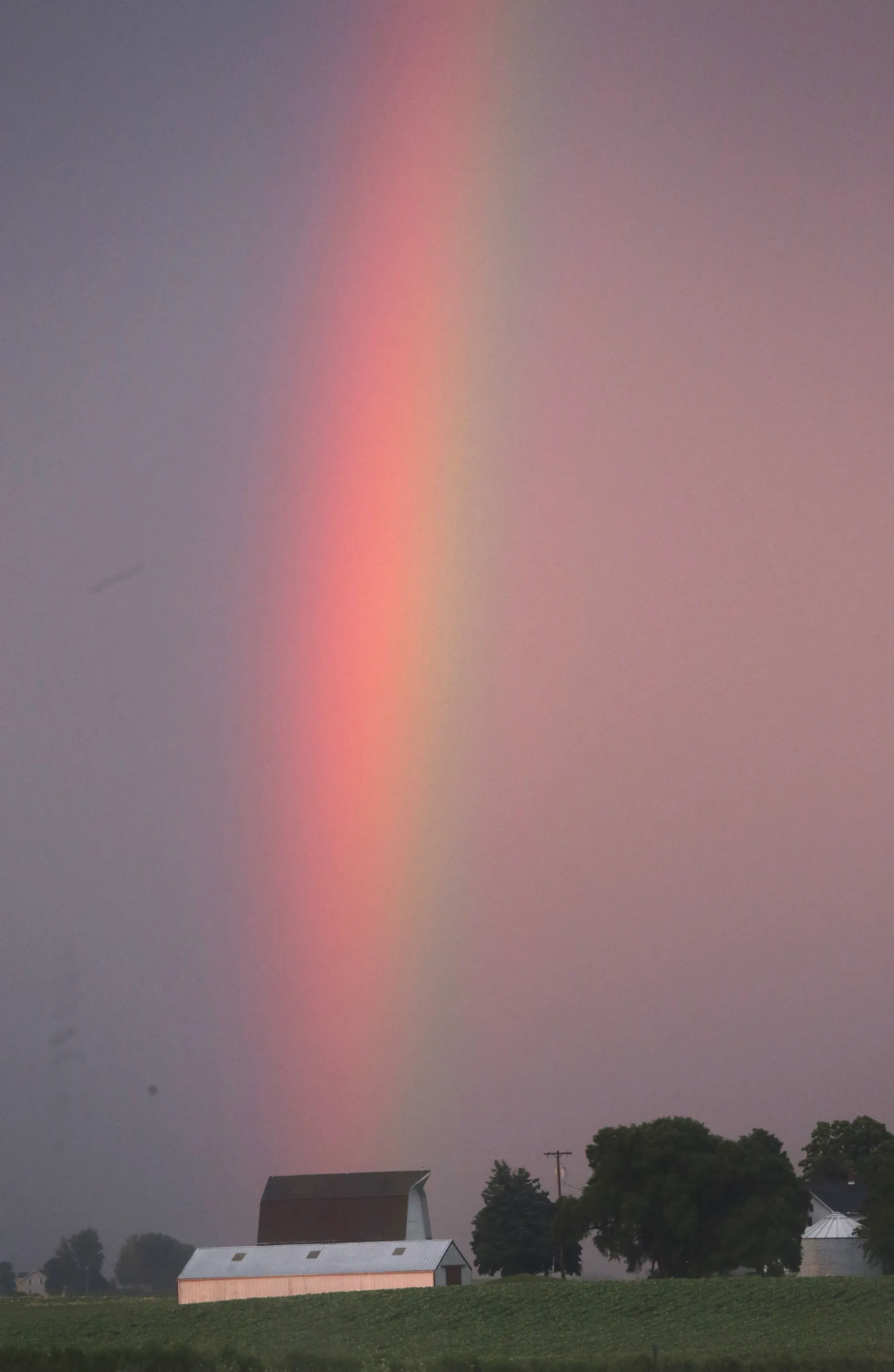 Motorists traveling eastbound on Interstate 80 towards Chicago are treated to a brilliant rainbow as the sun sets and a storm clears Sunday, July 13, 2014, in La Salle County, Ill. (Photo by Charles Rex Arbogast/AP Photo)
