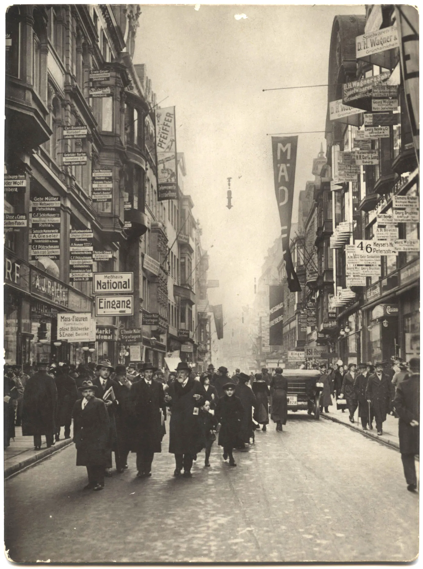 A street scene in an unidentified town. Signs along the buildings are in German. (Photo by Dr. P.A. Smithe/National World War I Museum, Kansas City, Mo.)