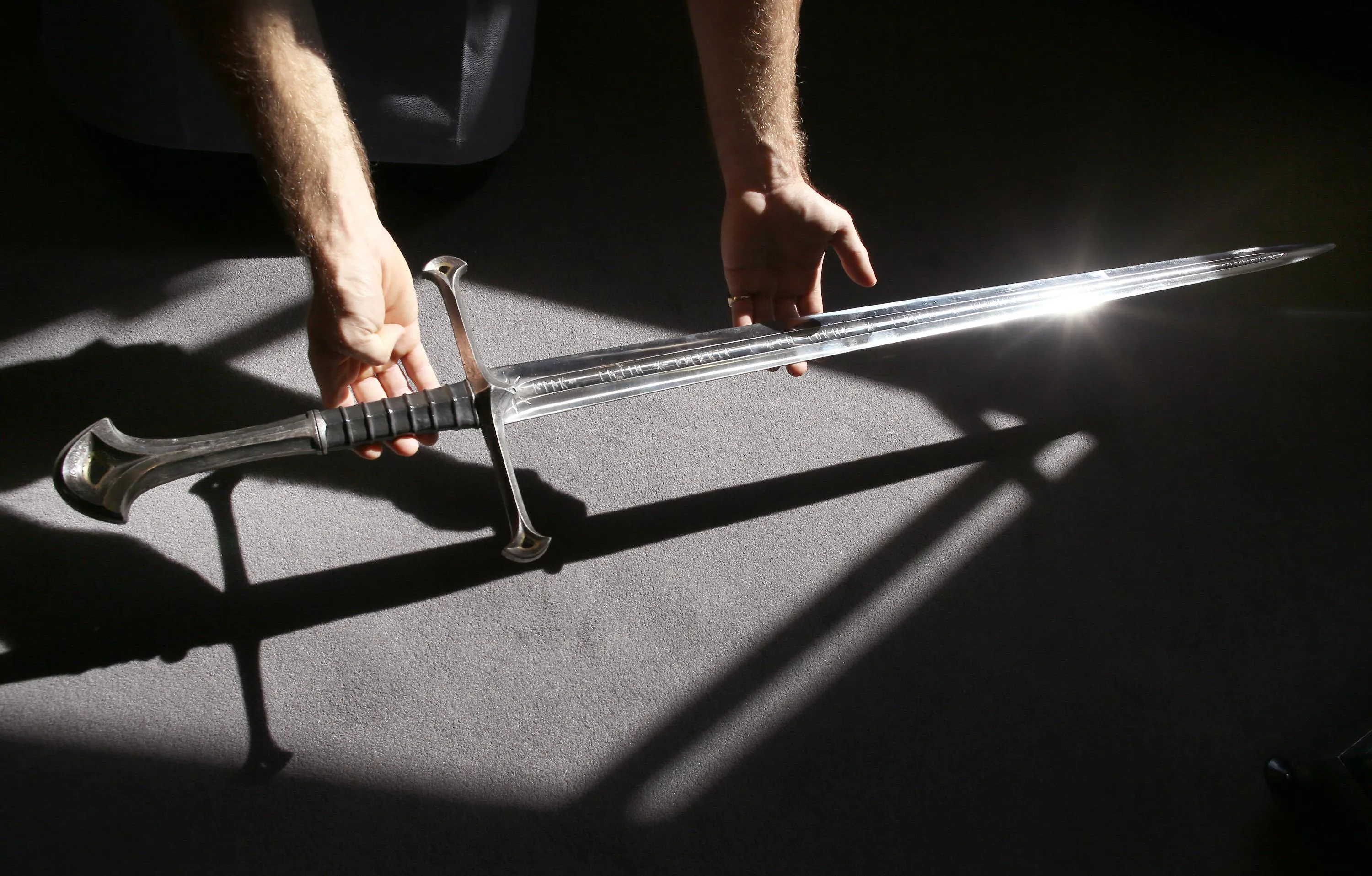 A Bonhams employee holds “Anduril” a prop sword belonging to Aragorn, hero of “The Lord of the Rings” movie trilogy on July 31, 2014 in London, England. The sword, belonging to actor Sir Christopher Lee and estimated at $150,000-250,000, forms part of Bonhams “There's No Place Like Hollywood” movie memorabilia auction taking place in New York on November 24, 2014. (Photo by Peter Macdiarmid/Getty Images)