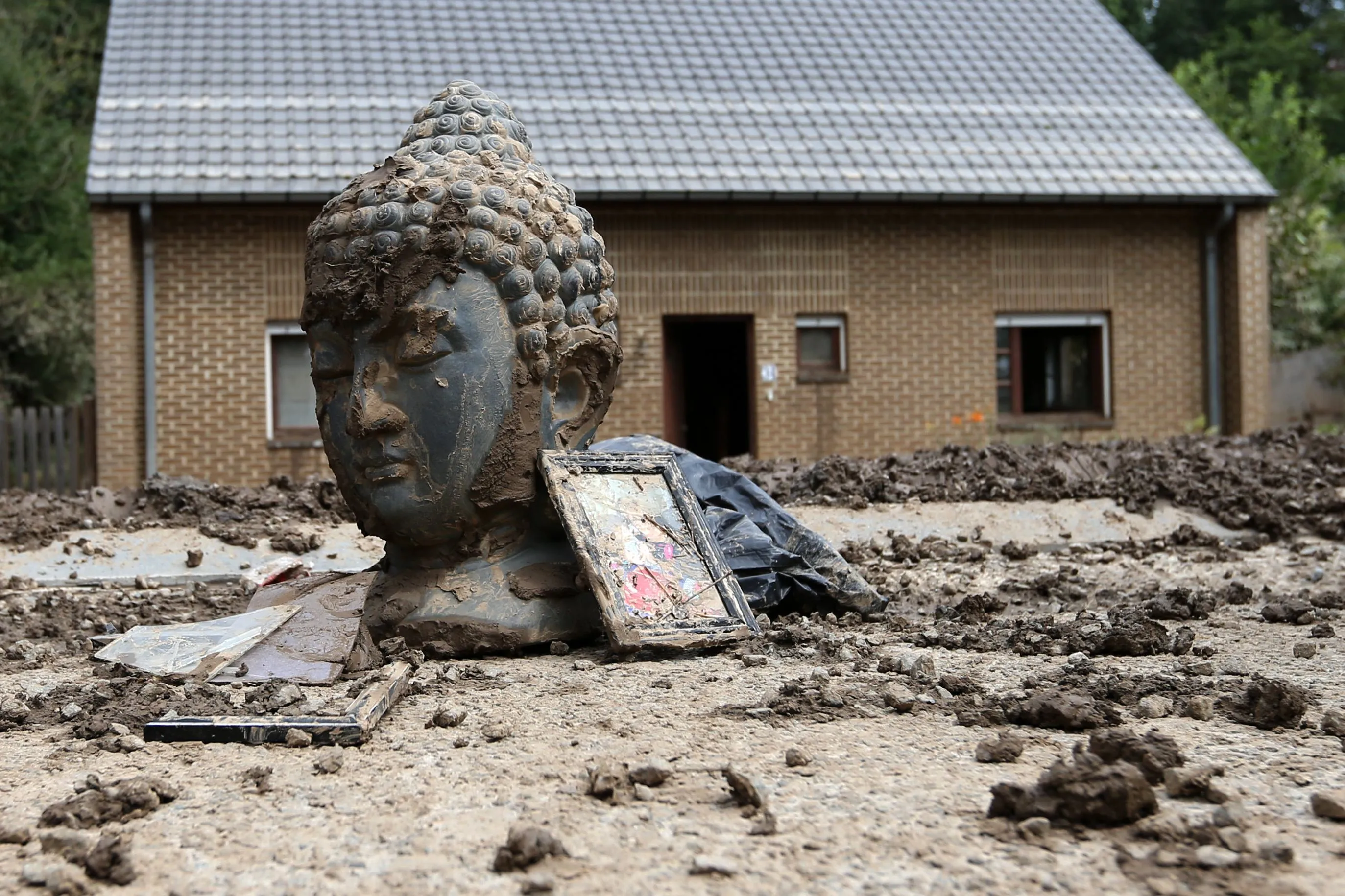 A statue of Buddha and storm debris are covered with mud outside a flooded house after heavy rains hit the town of Ittre July 30, 2014. (Photo by Francois Lenoir/Reuters)