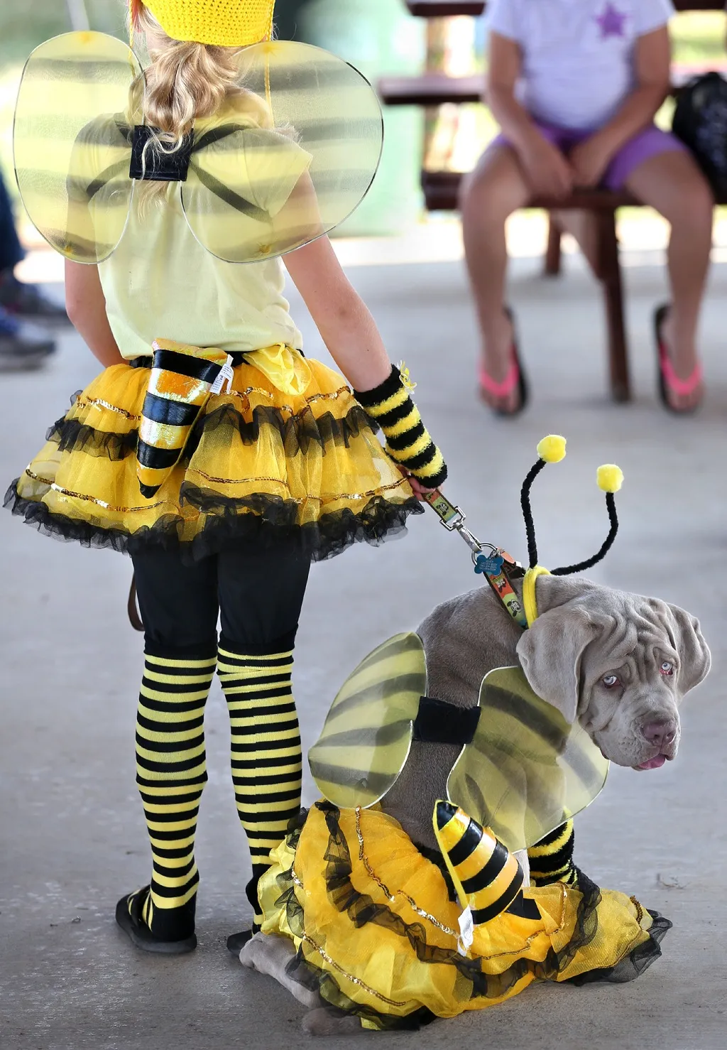 Homer, an 18-week-old mastiff, is dressed as a bumblebee along with his owner, Eddyn Molden, 8, of Middletown, Va. during the judging for the Best Costumed Pet at the Frederick County Fair in Clear Brook, Va. Thursday, July 31, 2014. (Photo by Jeff Taylor/AP Photo/The Winchester Star)