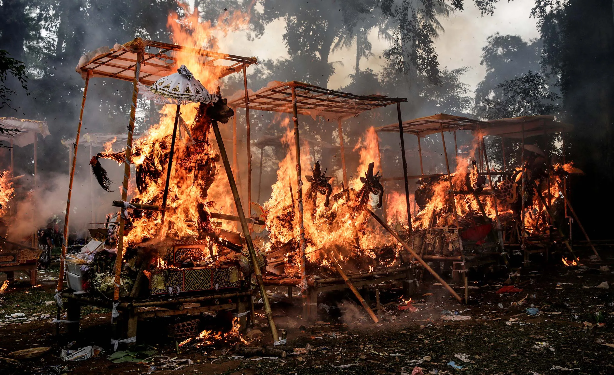 Sarcophagi burn at a cremation site during a mass cremation in Ubud, Bali, Indonesia, on August 1, 2014. More than 100 corpses were collectively cremated in the ceremony known as Ngaben Masal (Mass Cremation). Taking place every 4 years in Singakerta Village, it is one of the most important ceremonies for Balinese Hindu people. They believe that during the burnings the spirits of the deceased will be freed to reincarnate. (Photo by Agung Parameswara/Getty Images)