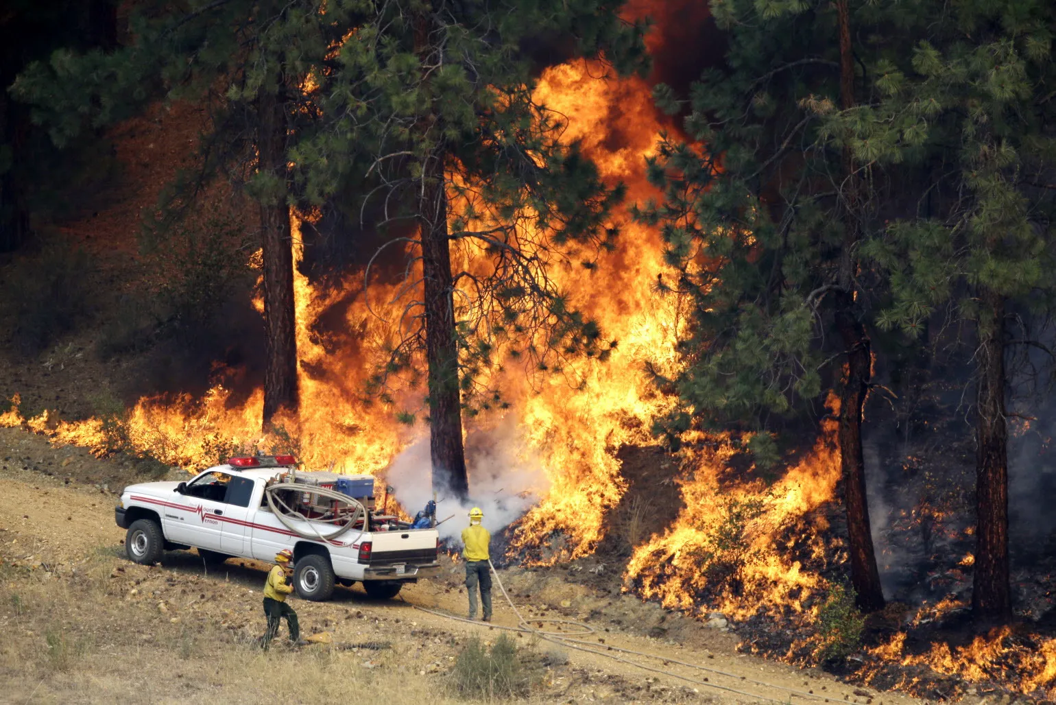 A firefighter cools a tree in a line of fire Friday, July 18, 2014, in Winthrop, Wash. A fire racing through rural north-central Washington destroyed about 100 homes, leaving behind smoldering rubble, solitary brick chimneys and burned-out automobiles as it blackened hundreds of square miles. (Photo by Elaine Thompson/AP Photo)
