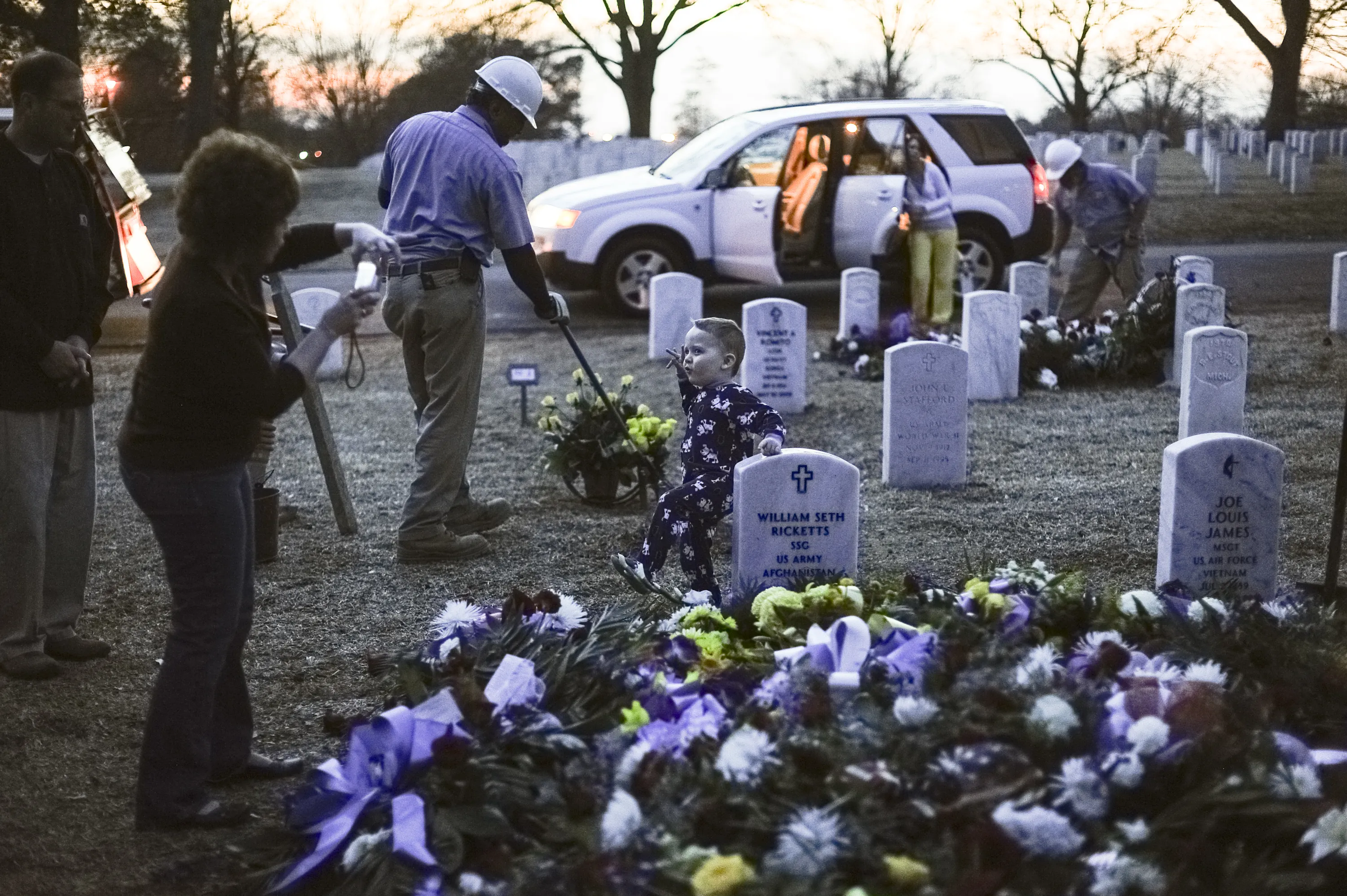 This is Ricketts' grave. His 3-year-old son Aiden poses like a ninja while his grandmother takes photos. (Photo and caption by Van Agtmael/Harrison Jacobs/Magnum Photos)