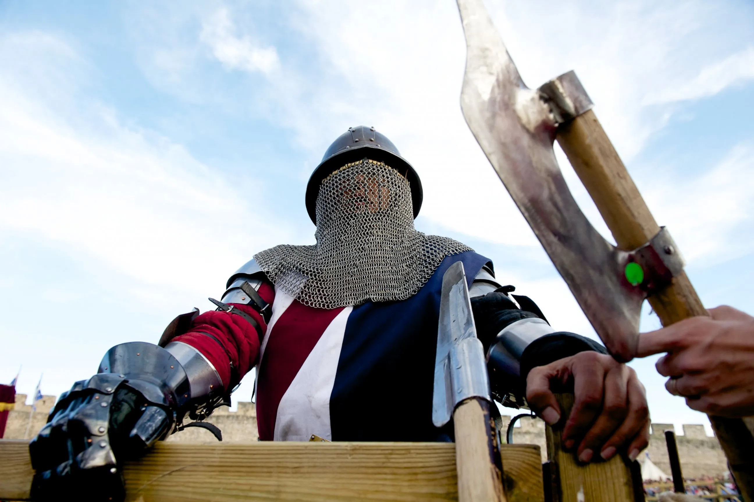 A member of the American armored combat league team, the USA Knights, chooses a weapon before combat during the International Medieval Combat at the castle of Belmonte, May 1, 2014, in Belmonte, Spain. “All the edges on weapons have to be 2-millimeter wide”, said USA Knights team captain Andre Sinou. “We'll go over the blades... so that there are no sharp edges that could puncture”. (Photo by Juan Naharro Gimenez/Getty Images)