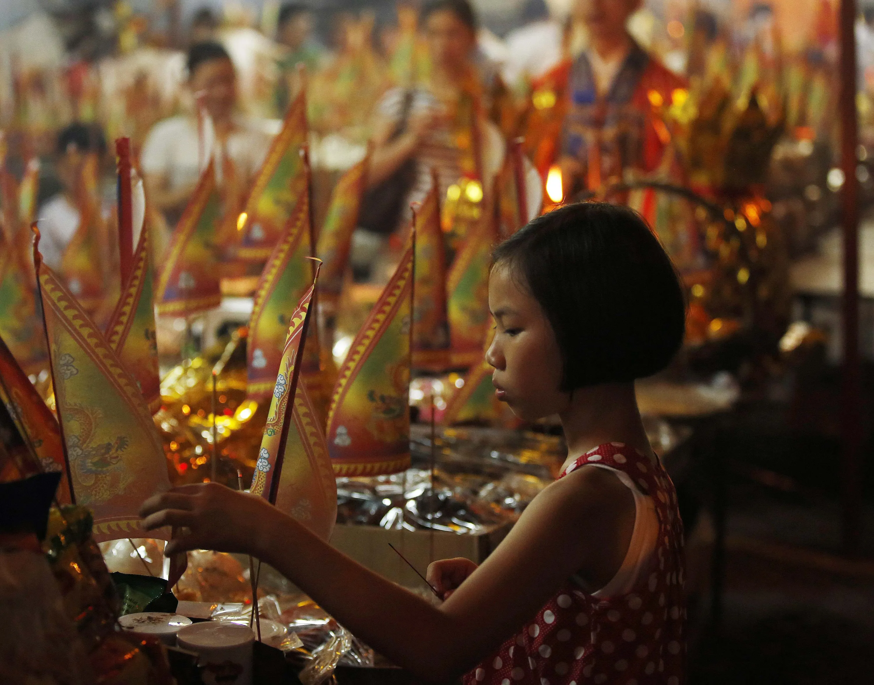 A child decorates food offerings at the Hungry Ghost festival in Kuala Lumpur August 3, 2014. According to Taoist and Buddhist beliefs, the seventh month of the Chinese Lunar calendar, known as the Hungry Ghost Festival is when the Gates of Hell open to let out spirits who wander the land of the living looking for food. Food offerings are made while paper money and joss sticks are burnt to keep the spirits of dead ancestors happy and to bring good luck. (Photo by Olivia Harris/Reuters)