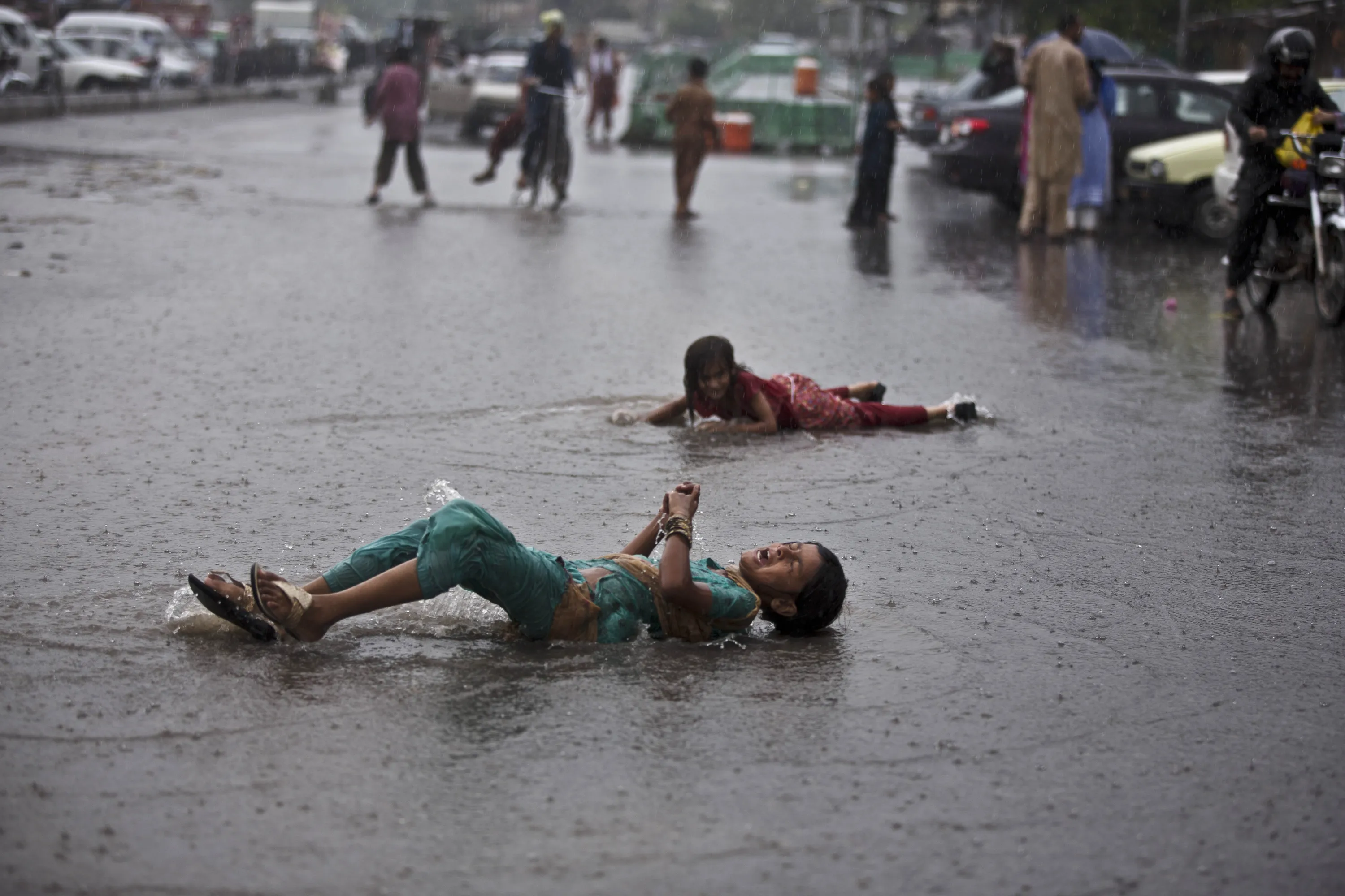 Pakistani girls who sell sweets to worshippers at a shrine, enjoy rolling on a flooded street during a sudden heavy rain fall after days of scorching temperatures due to a heat wave, in Islamabad, Pakistan, Thursday, August 7, 2014. (Photo by Muhammed Muheisen/AP Photo)