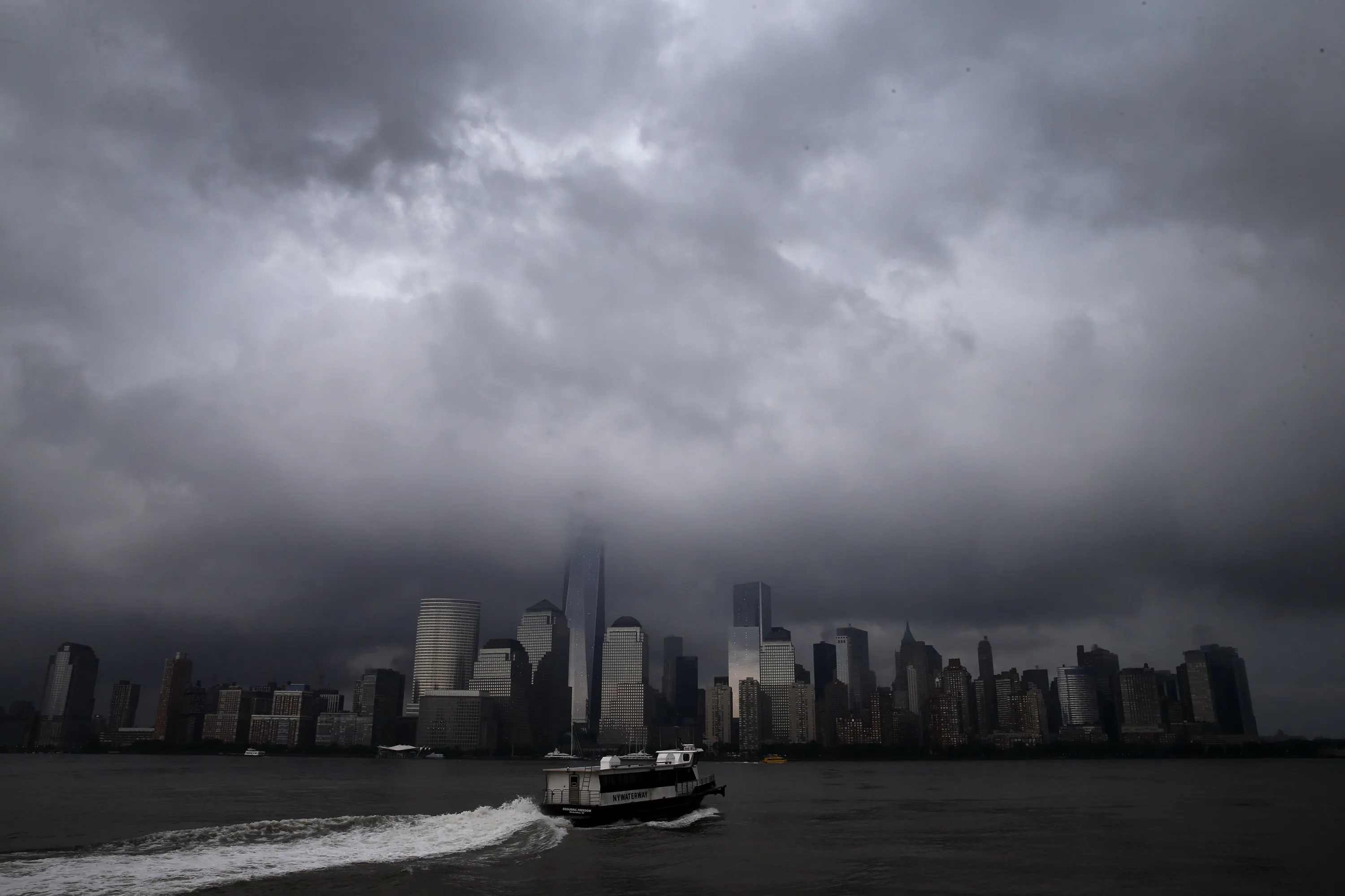 A ferry leaves Jersey City, New Jersey as it heads across the Hudson River towards lower Manhattan and New York City as a heavy thunderstorm passes over the area July 15, 2014. According to local reports severe thunderstorm and flash flooding warnings were issued for a second straight day as a powerful series of storms affected much of the northeast U.S. (Photo by Mike Segar/Reuters)