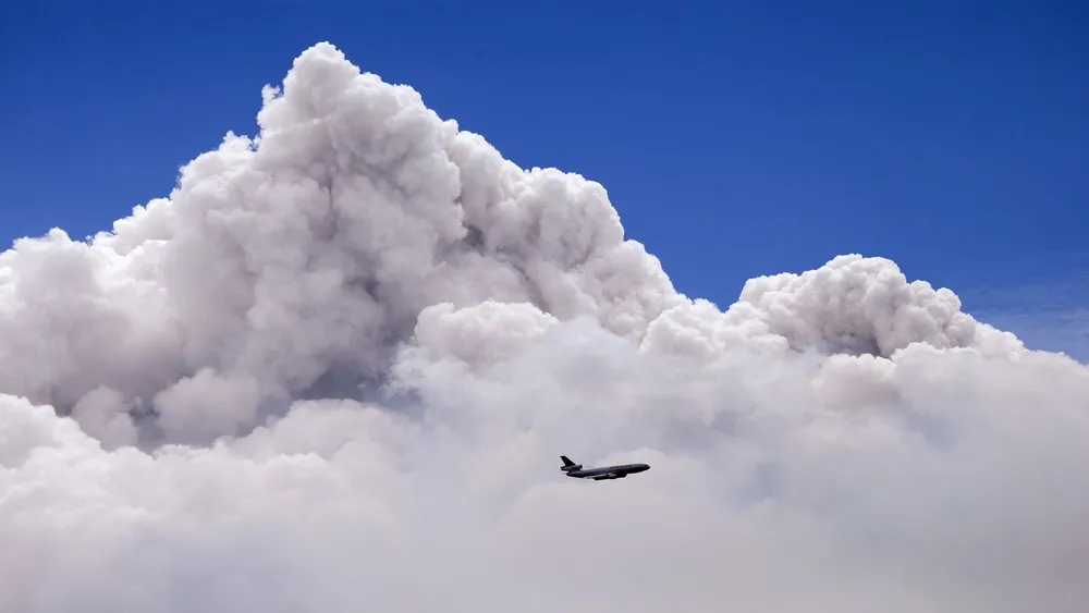 A DC-10 air tanker is dwarfed by the tip of a rising smoke cloud as the plane prepares to drop fire retardant over a wildfire near Carlton, Washington, on July 19, 2014. A wind-driven, lightning-caused wildfire racing through rural north-central Washington destroyed about 100 homes Thursday and Friday, leaving behind solitary brick chimneys and burned-out automobiles as it blackened hundreds of square miles in the scenic Methow Valley northeast of Seattle. (Photo by Elaine Thompson/AP Photo)